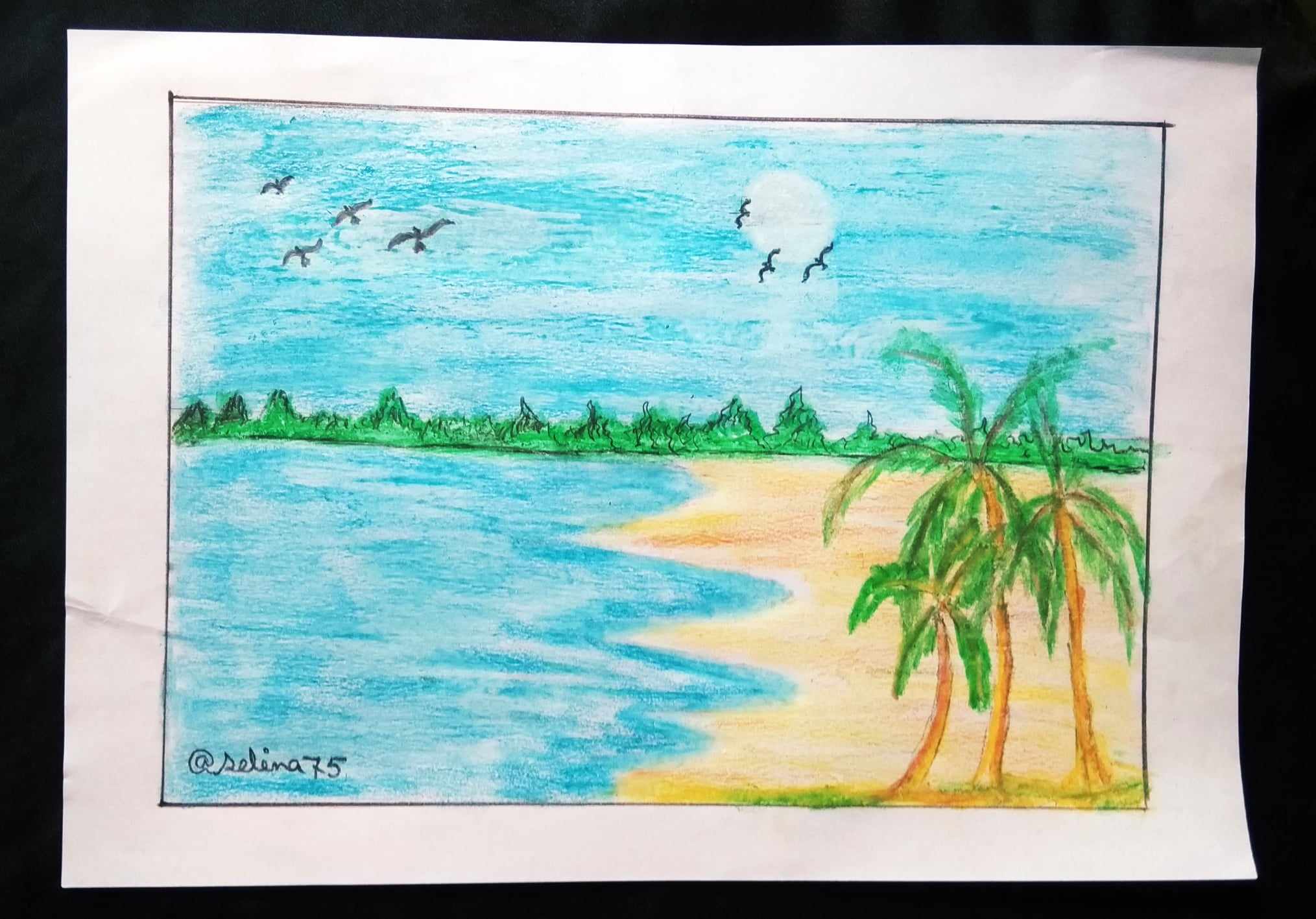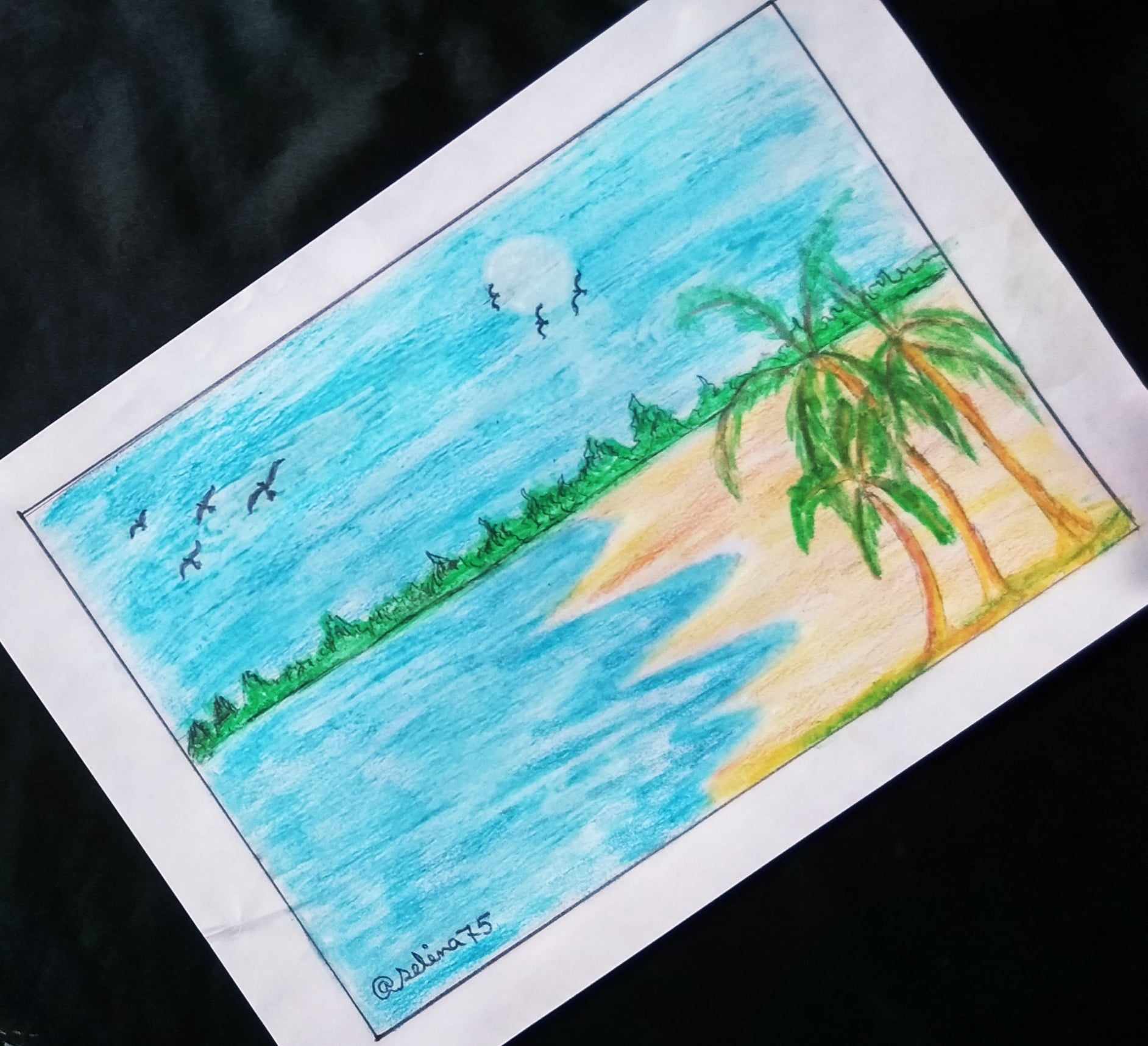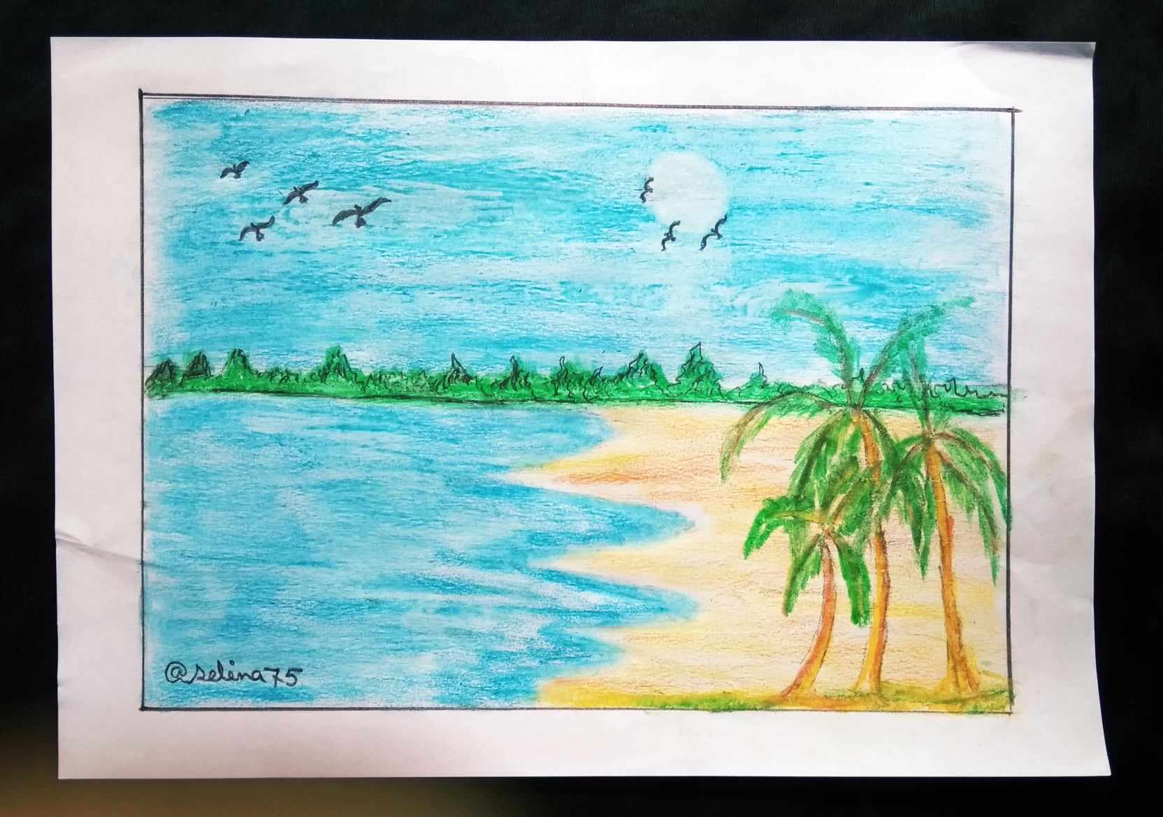 হলুদ রং ও খয়েরী রং দিয়ে সমুদ্রের পাড় এঁকে নিলাম। এবং রাবার দিয়ে মুছে সুর্য্য এঁকে নিলাম। সাথে সমুদ্রের পাড়ে নারিকেল গাছ ও আকাশে কিছু পাখি এঁকে নিয়ে আমার ছবি আঁকা শেষ করলাম।