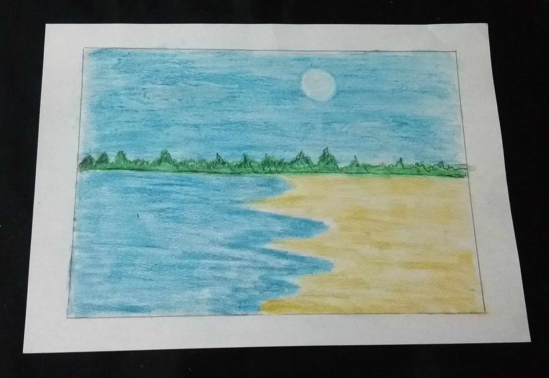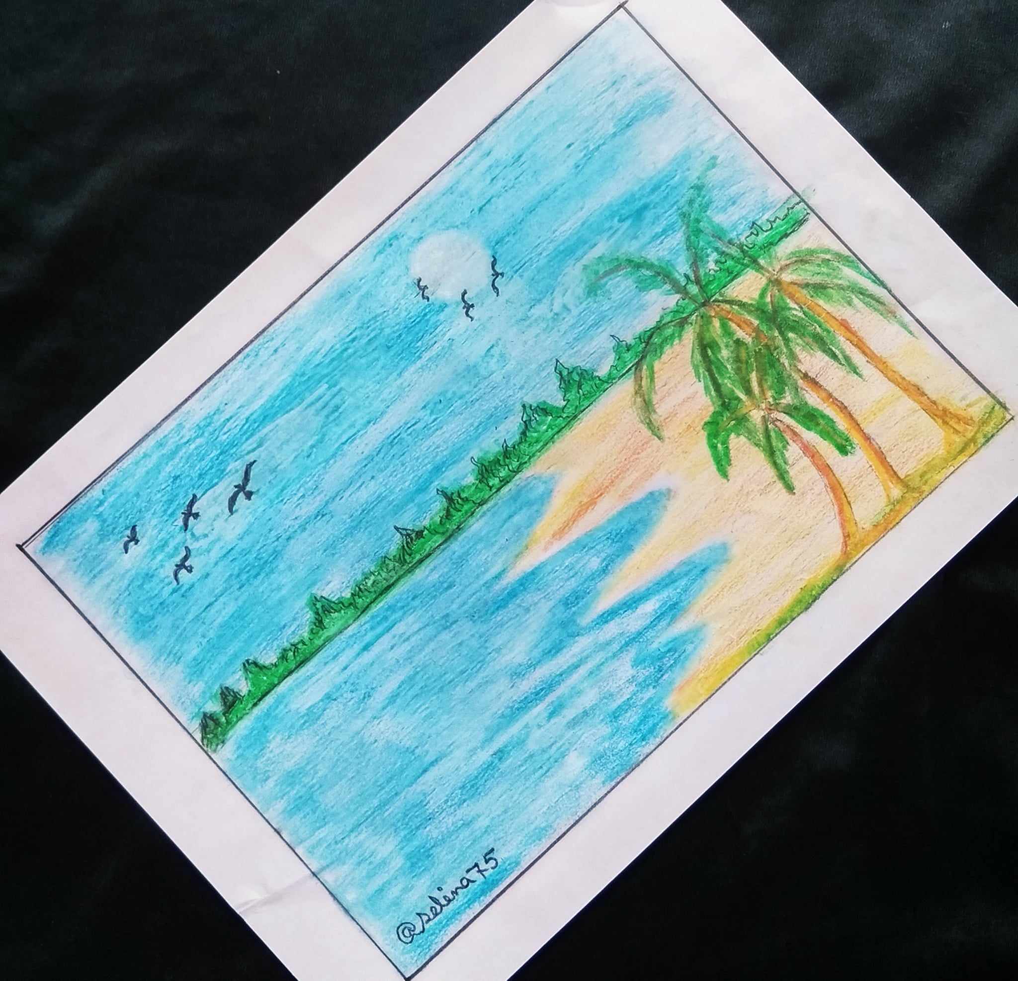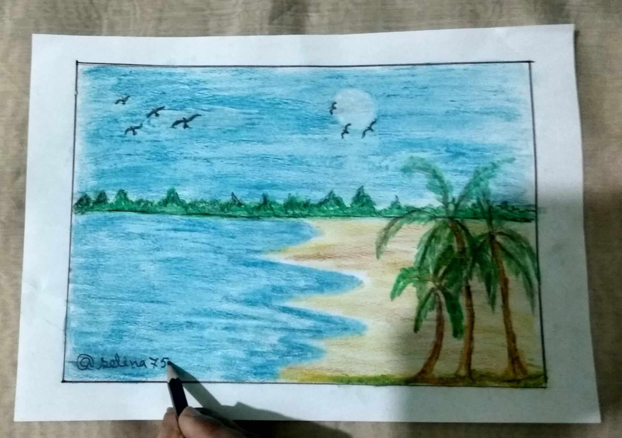 হলুদ রং ও খয়েরী রং দিয়ে সমুদ্রের পাড় এঁকে নিলাম। এবং রাবার দিয়ে মুছে সুর্য্য এঁকে নিলাম। সাথে সমুদ্রের পাড়ে নারিকেল গাছ ও আকাশে কিছু পাখি এঁকে নিয়ে আমার ছবি আঁকা শেষ করলাম।