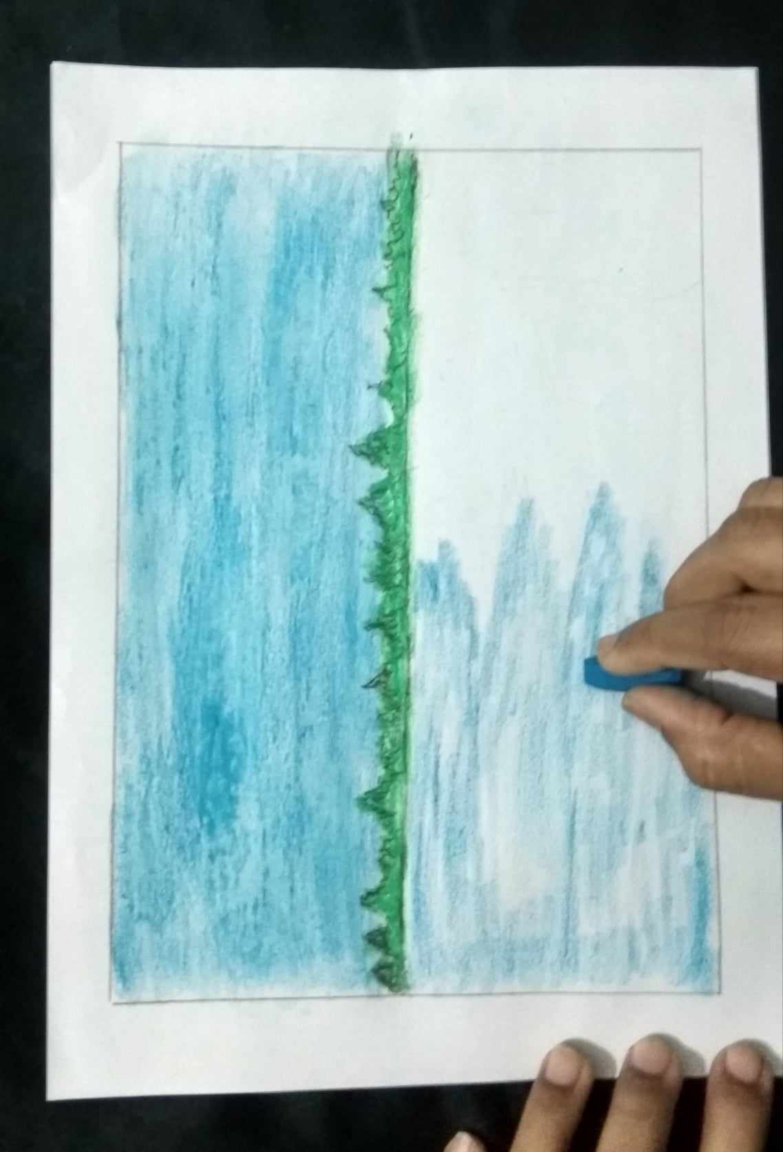 কাগজের উপরের অংশে হাল্কা নীল ও আকাশী রং করে নিলাম আকাশ বোঝানোর জন্য।