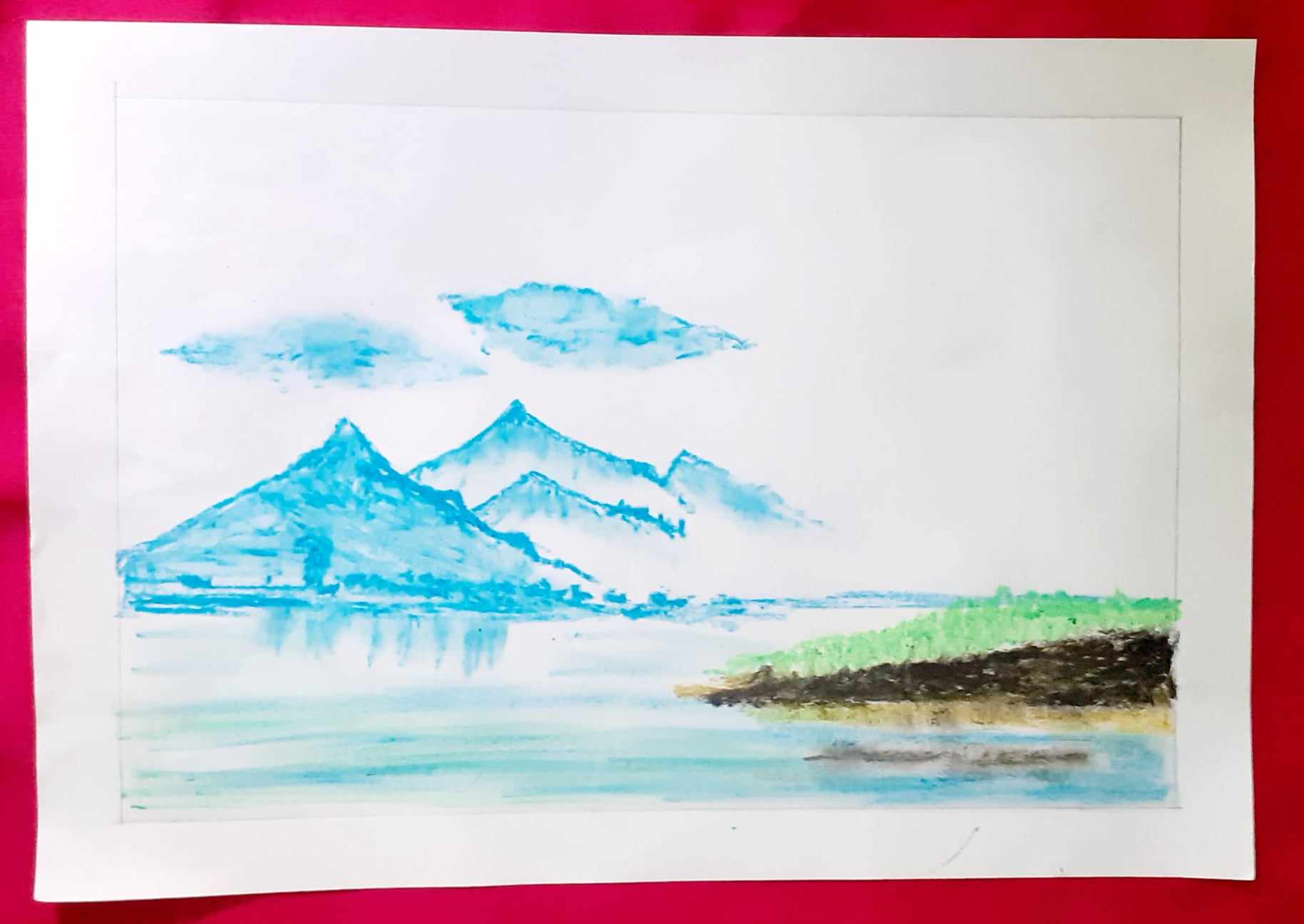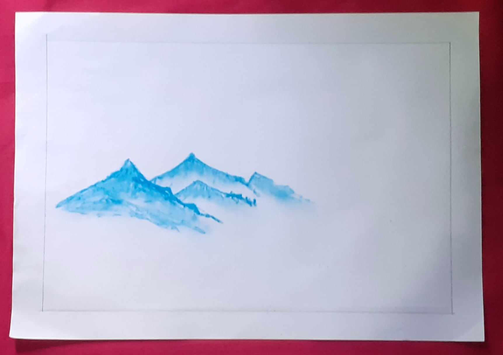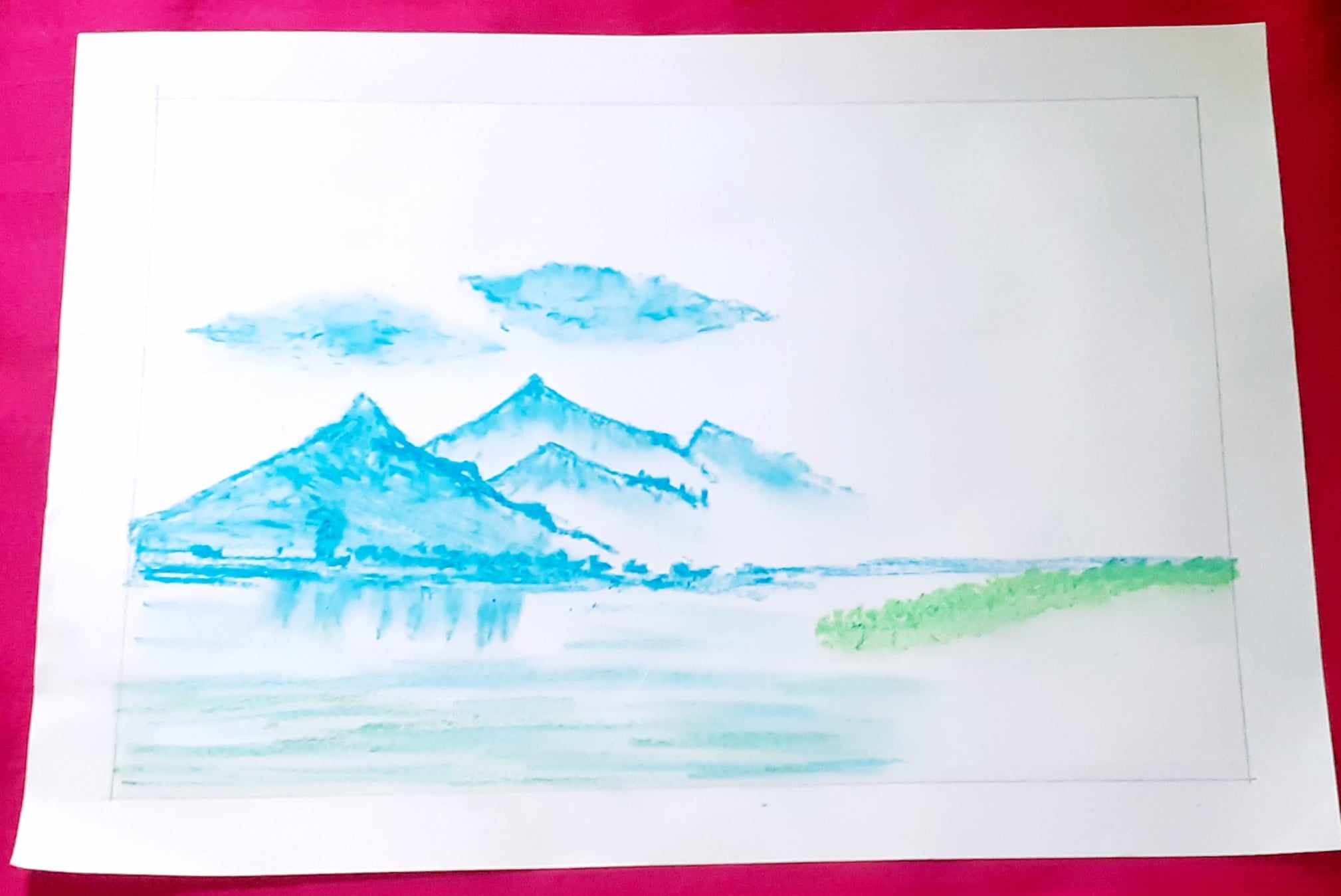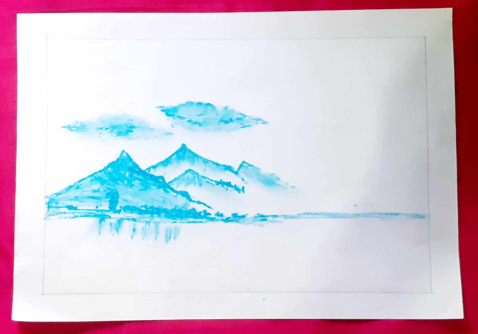 এরপর নীল রং দিয়ে পাহাড় এঁকে নিয়েছি। এবং আঙ্গুল দিয়ে নিচের দিকে একটু ঘসে হাল্কা করে নিয়েছি।