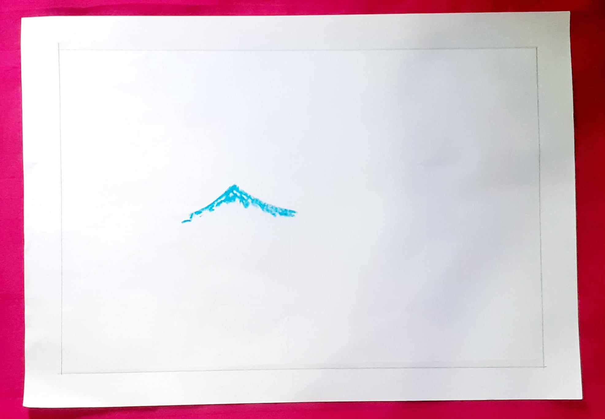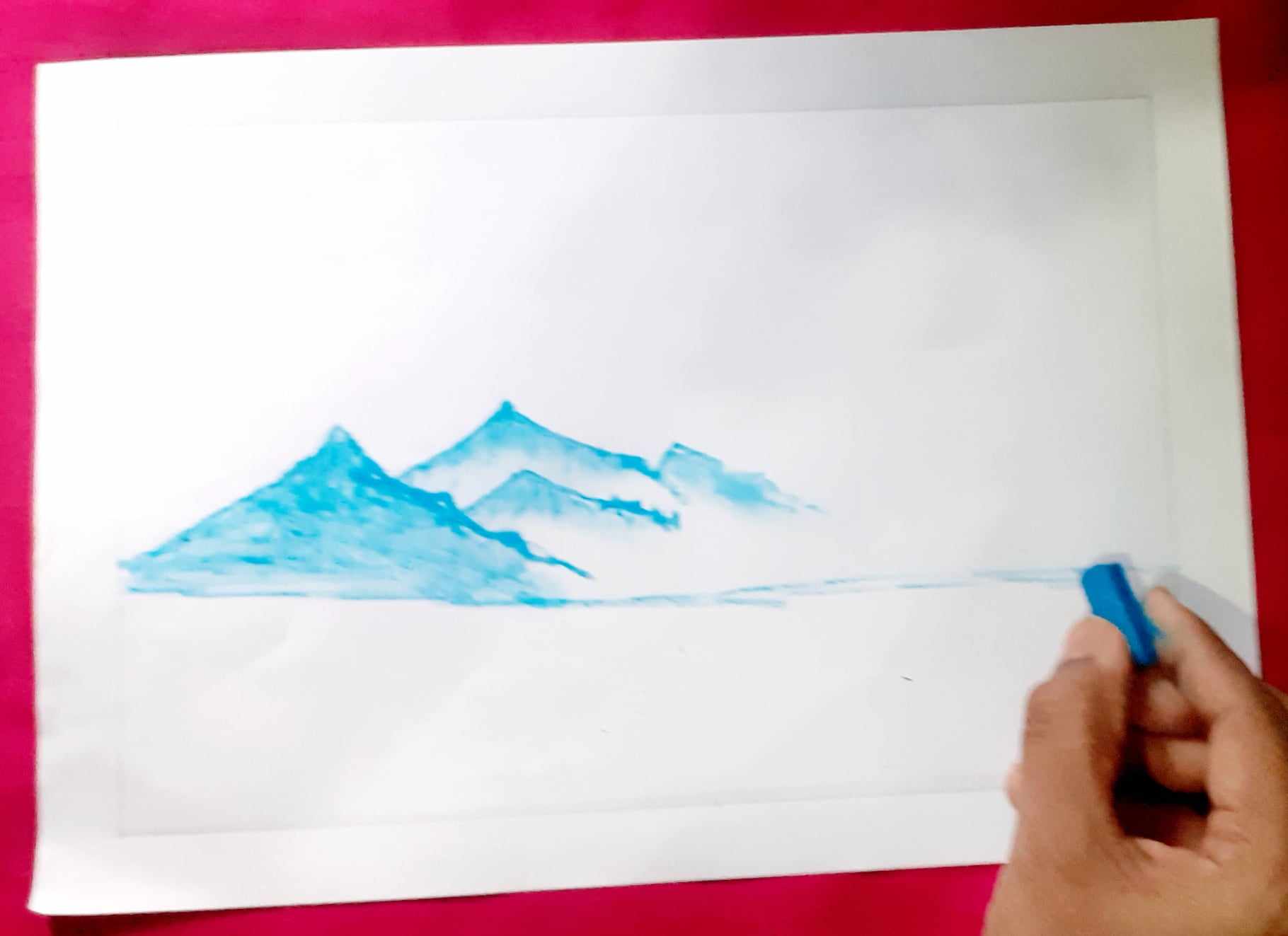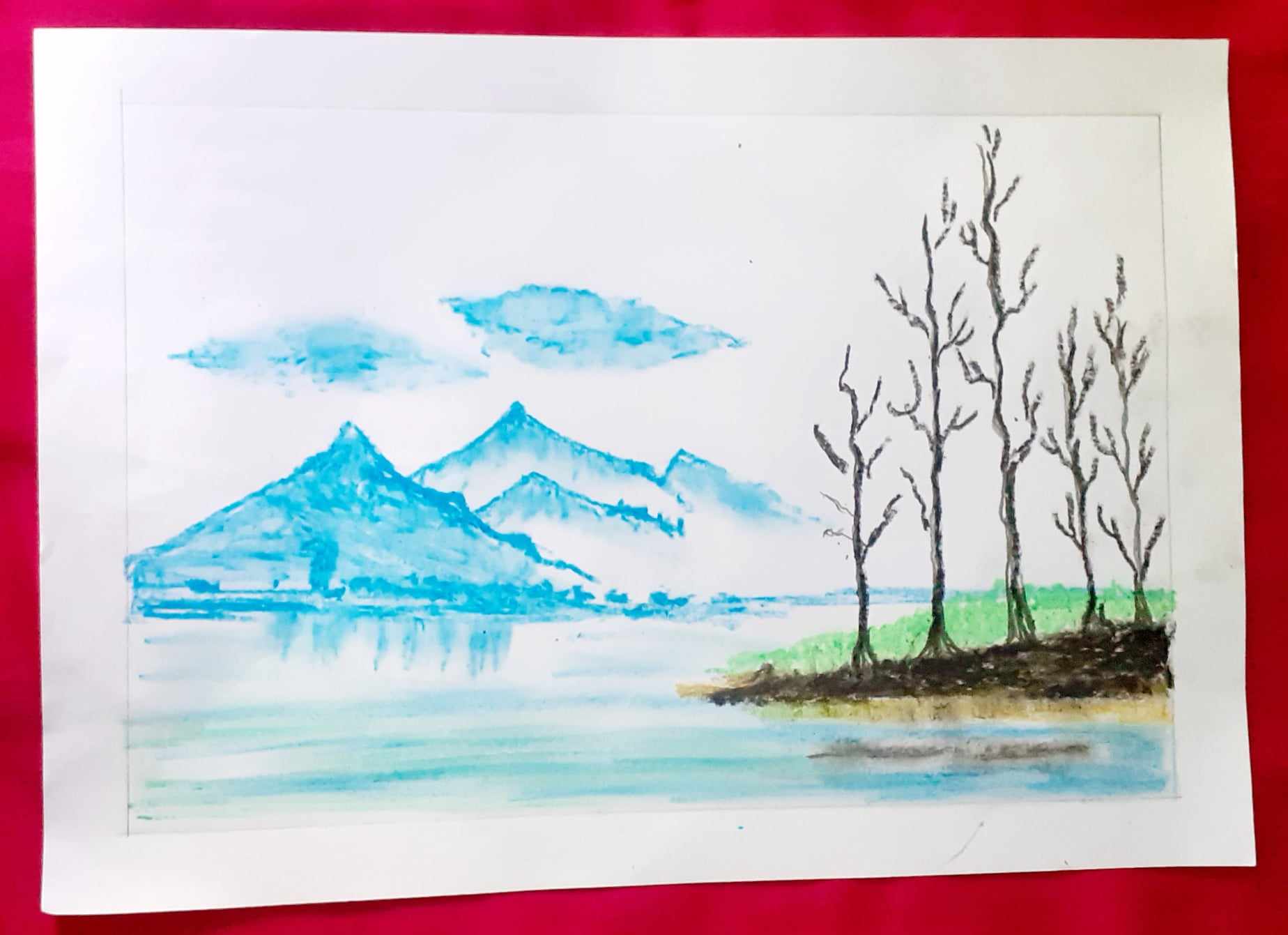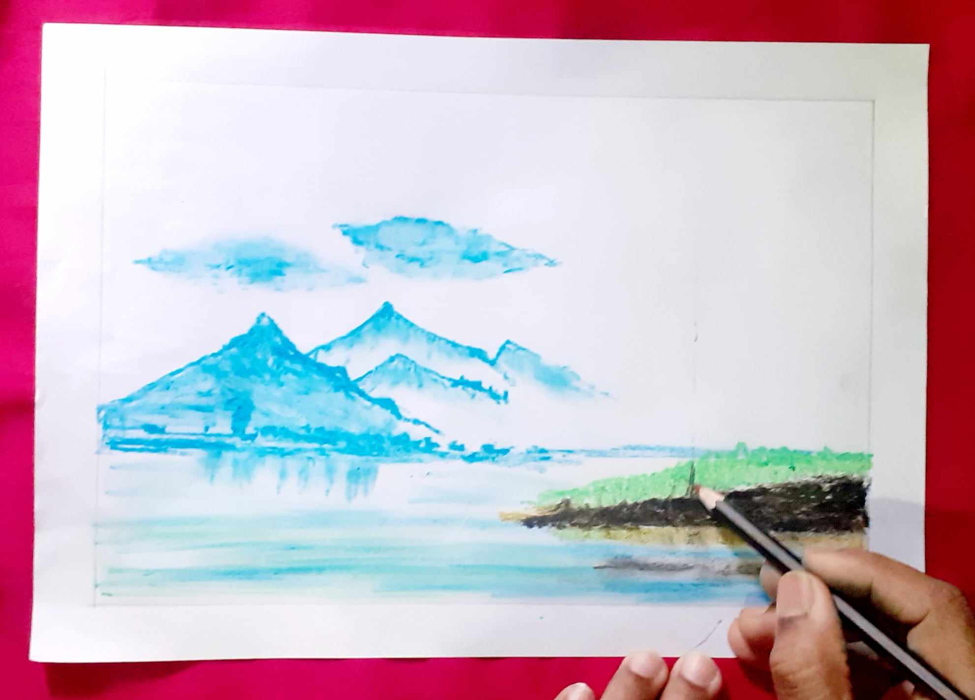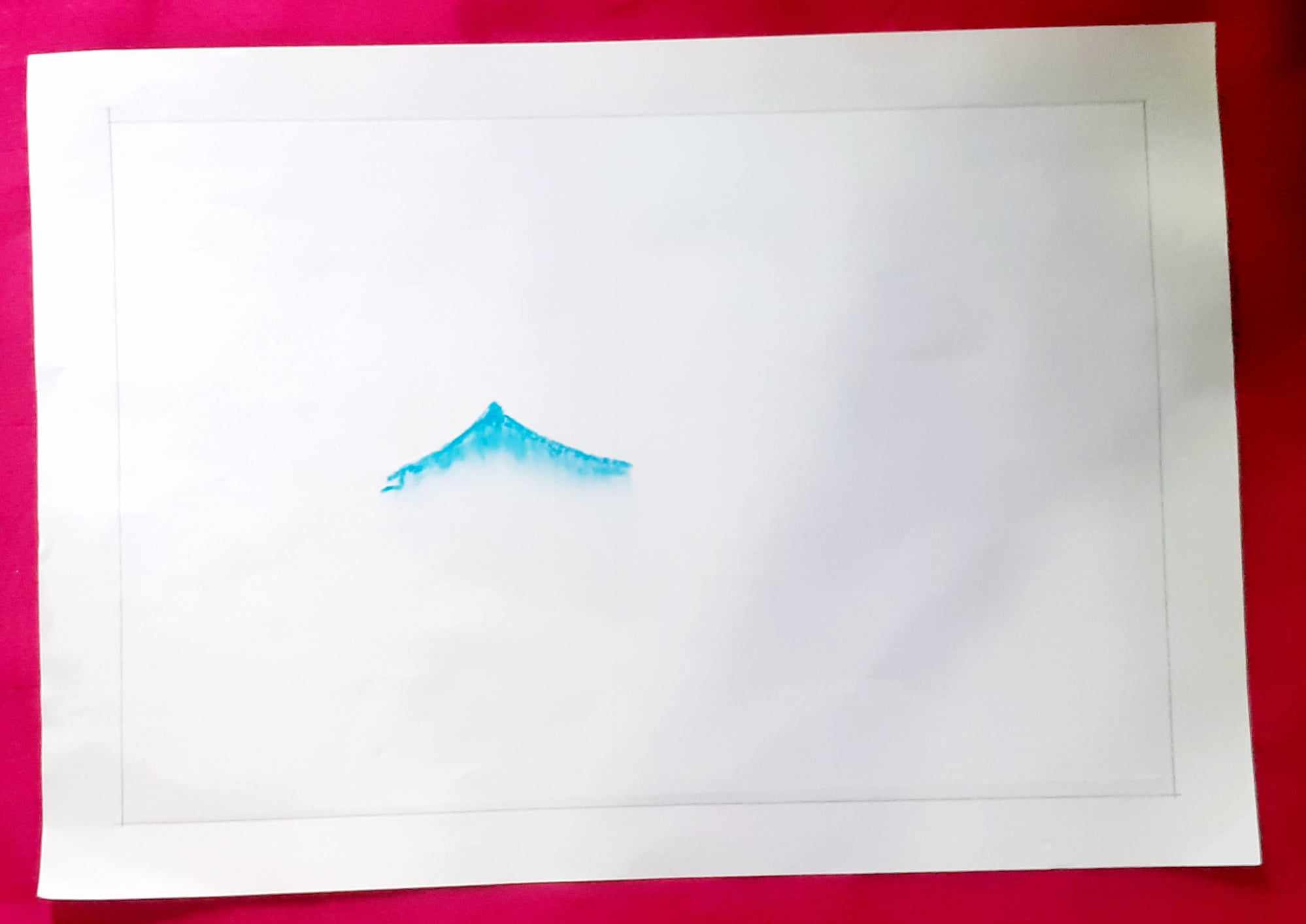 এরপর নীল রং দিয়ে পাহাড় এঁকে নিয়েছি। এবং আঙ্গুল দিয়ে নিচের দিকে একটু ঘসে হাল্কা করে নিয়েছি।