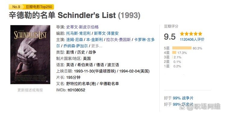 9.5高分的辛德勒的名单电影评分骤降至4.2!巴以冲突,电影评分也受牵连?david-world (28)in #schindler • 3 years ago 9.5高分的辛德勒的名单电影评分骤降至4.2!巴以冲突,电影评分也受牵连? 巴以冲突爆发,巴勒斯坦的家园被以色列轰炸摧毁,巴勒斯坦人流离失所,痛苦不堪,以色列的行为遭到世界谴责! 一部曾经描述犹太人被纳粹屠杀的电影《辛德勒的名单》因此受到波及,广大网友对这部电影进行了负面的评价,导致该电影评分由9.5下降到了4.2!为正义感的网友点赞! 还有网友称,看到现在的以色列,纷纷对电影产生了厌恶感,真的可以改为《希特勒的名单》了! #list