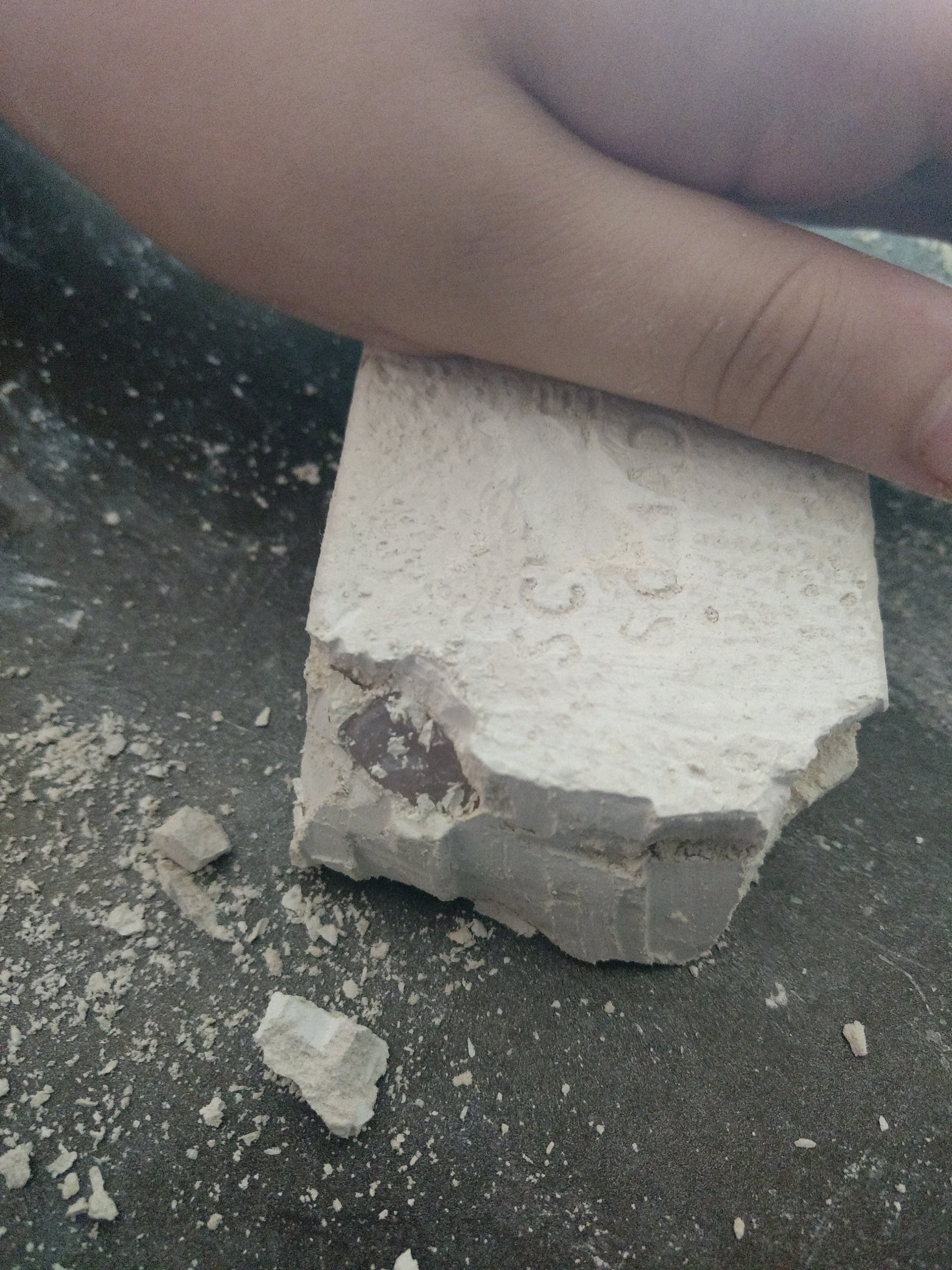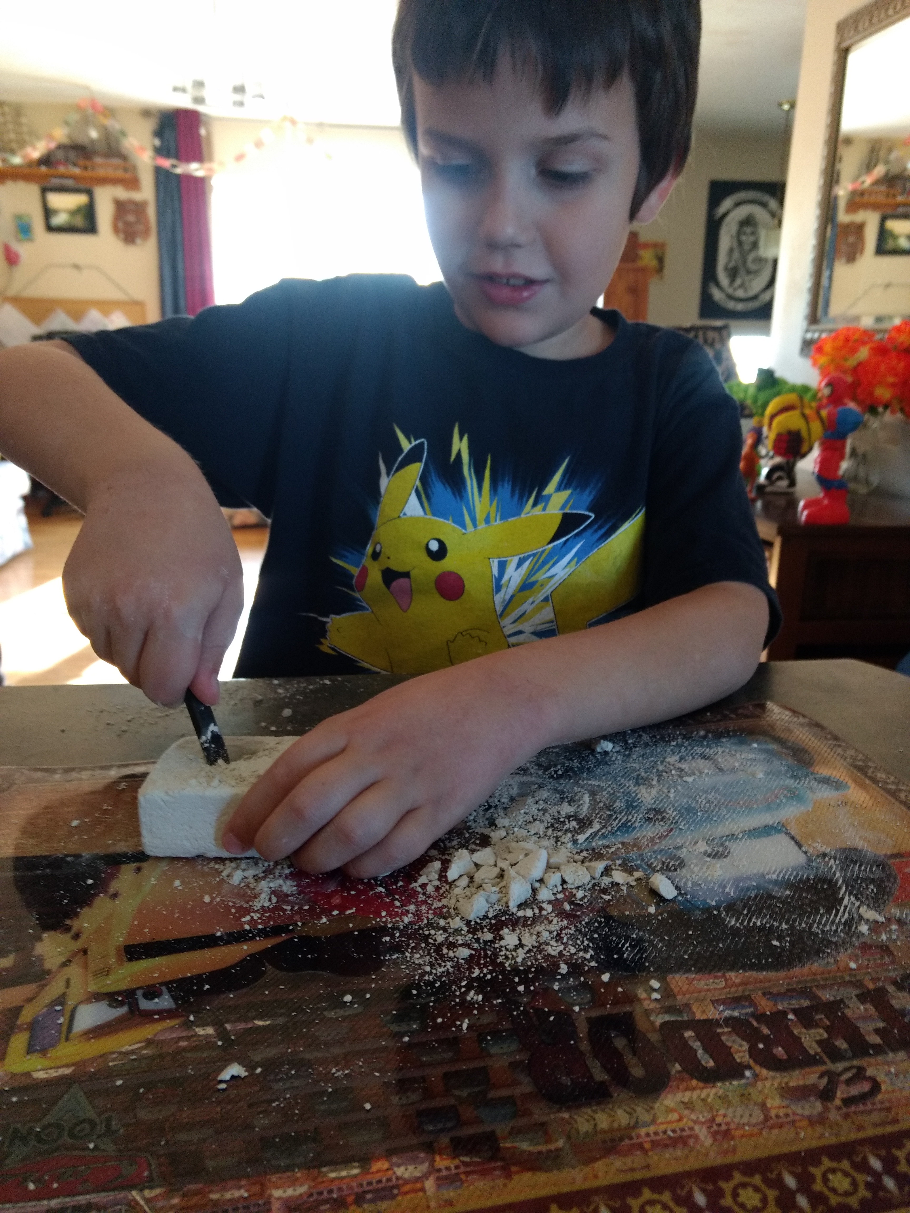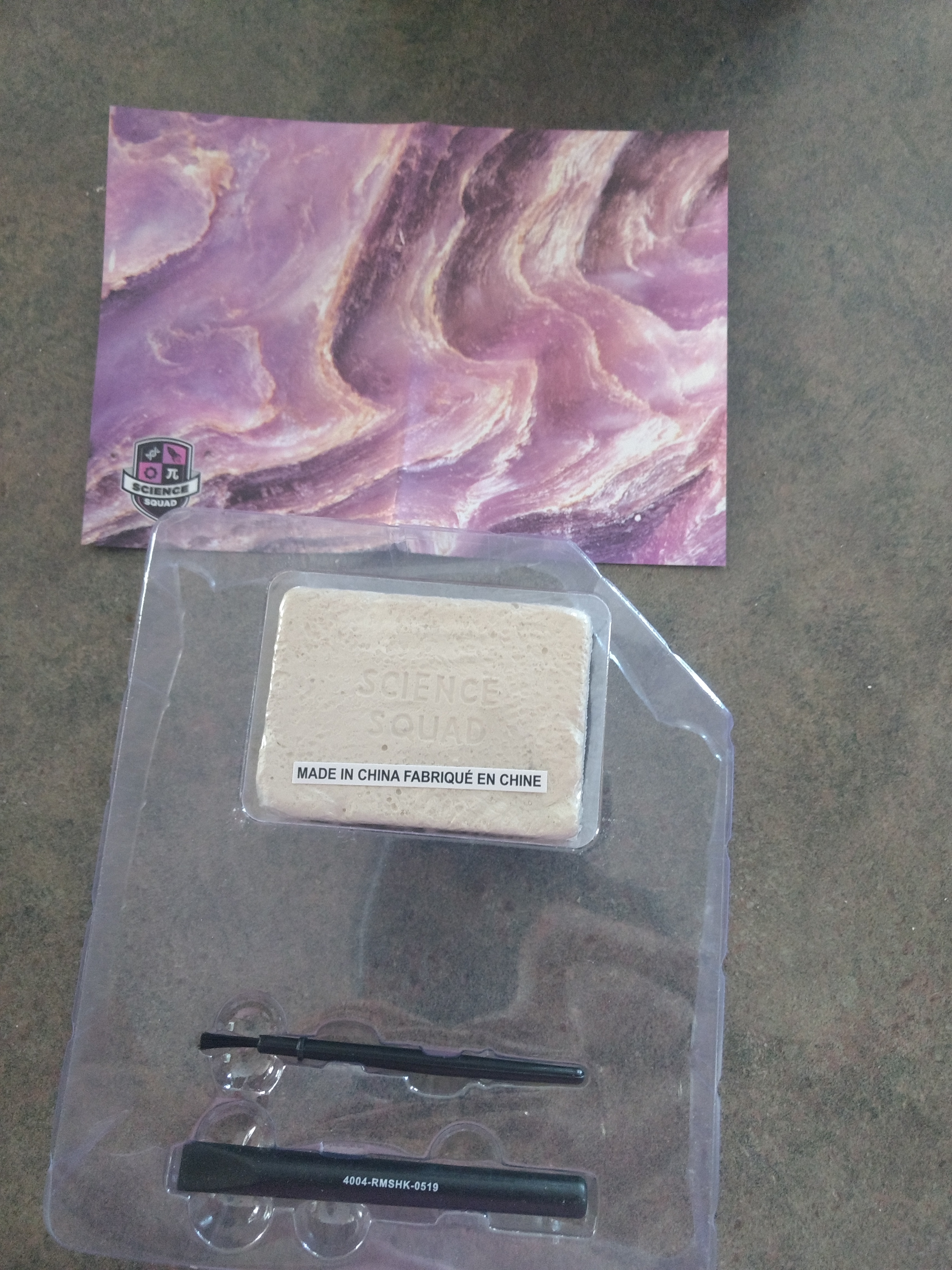 Step 2 open up our box and display its contents,the tools are used to slowly and carefully chip away the sandstone and brush off the particles where as the block with the gems is a representative of the earth millions of years ago.