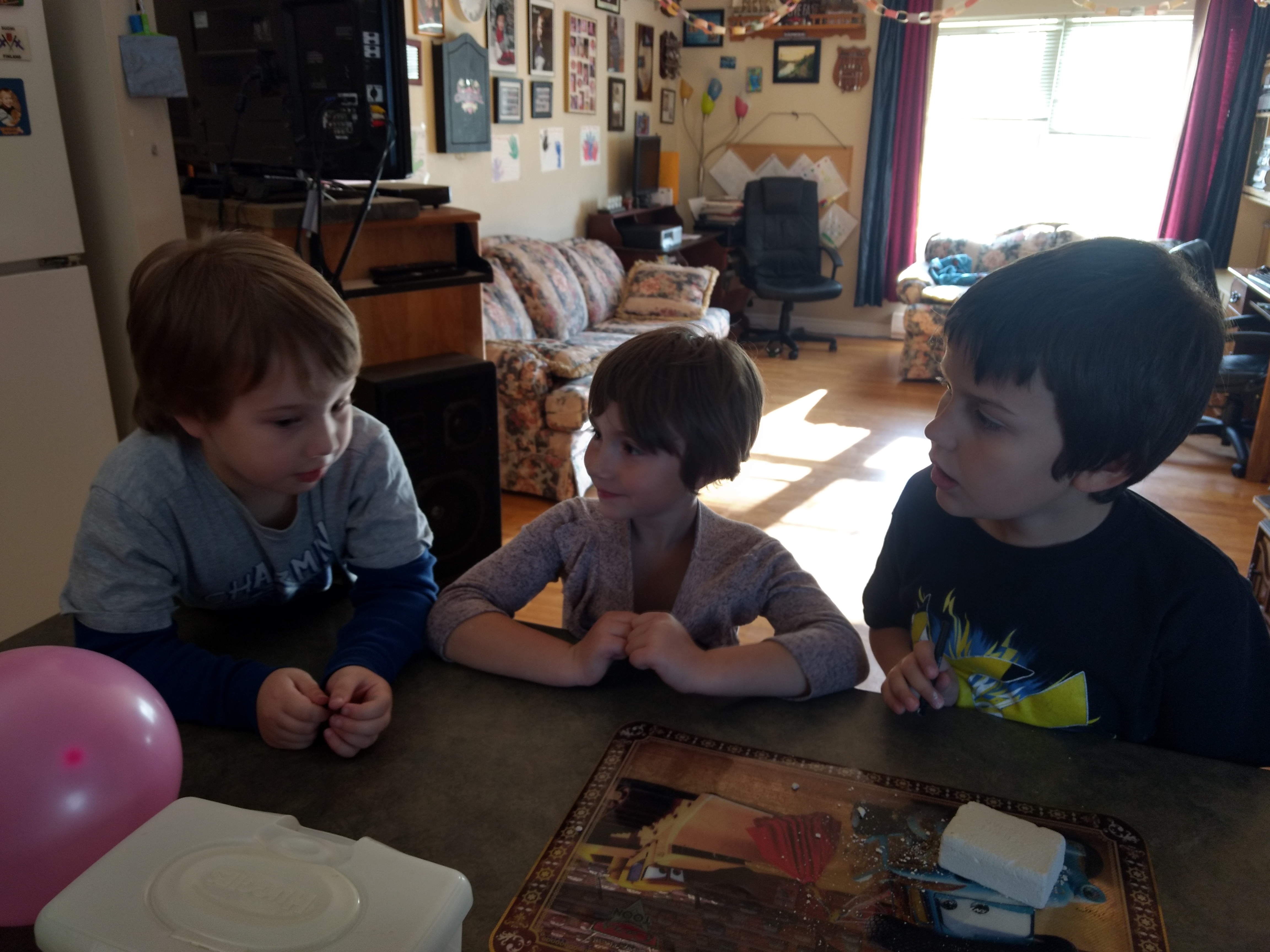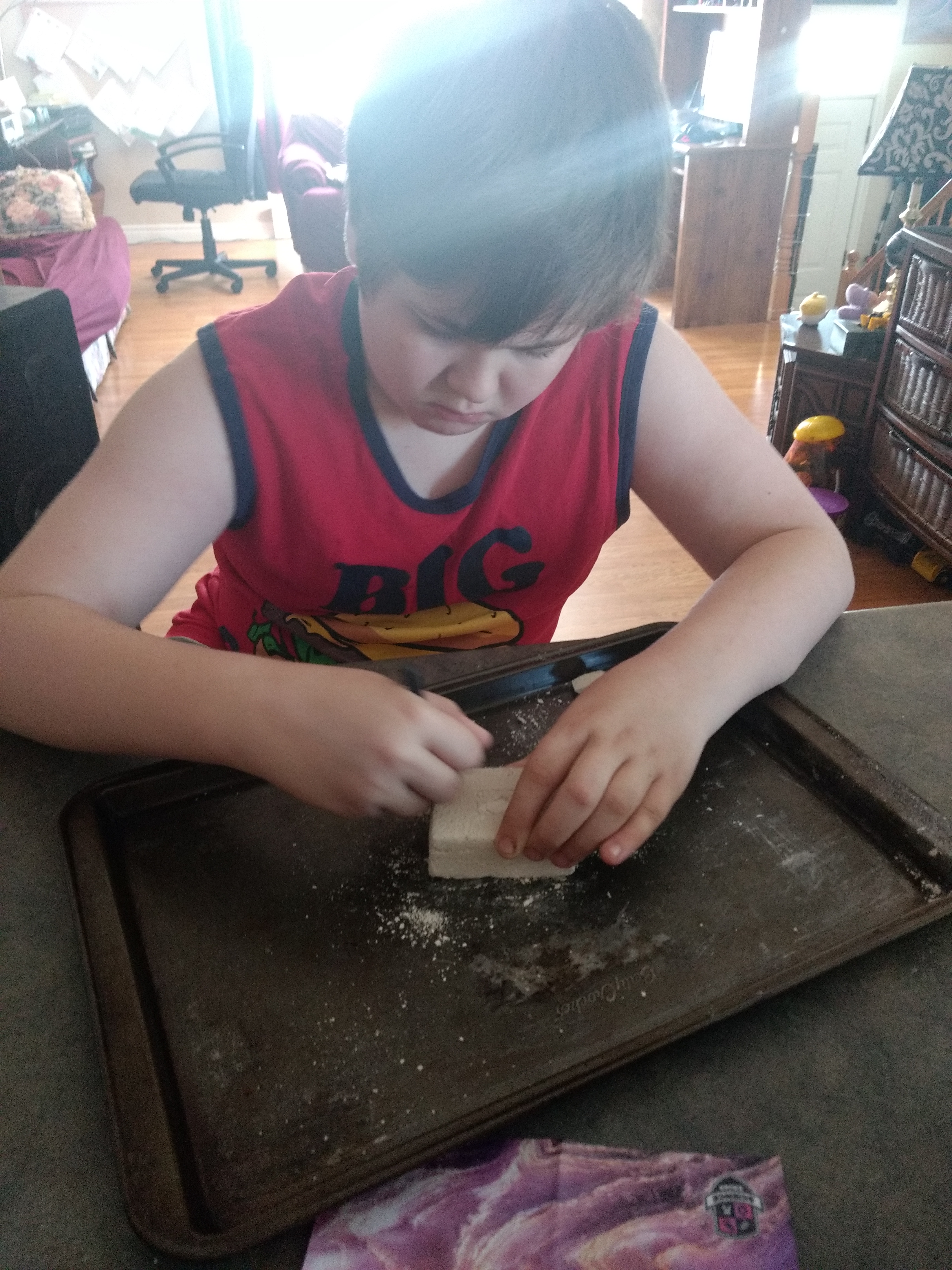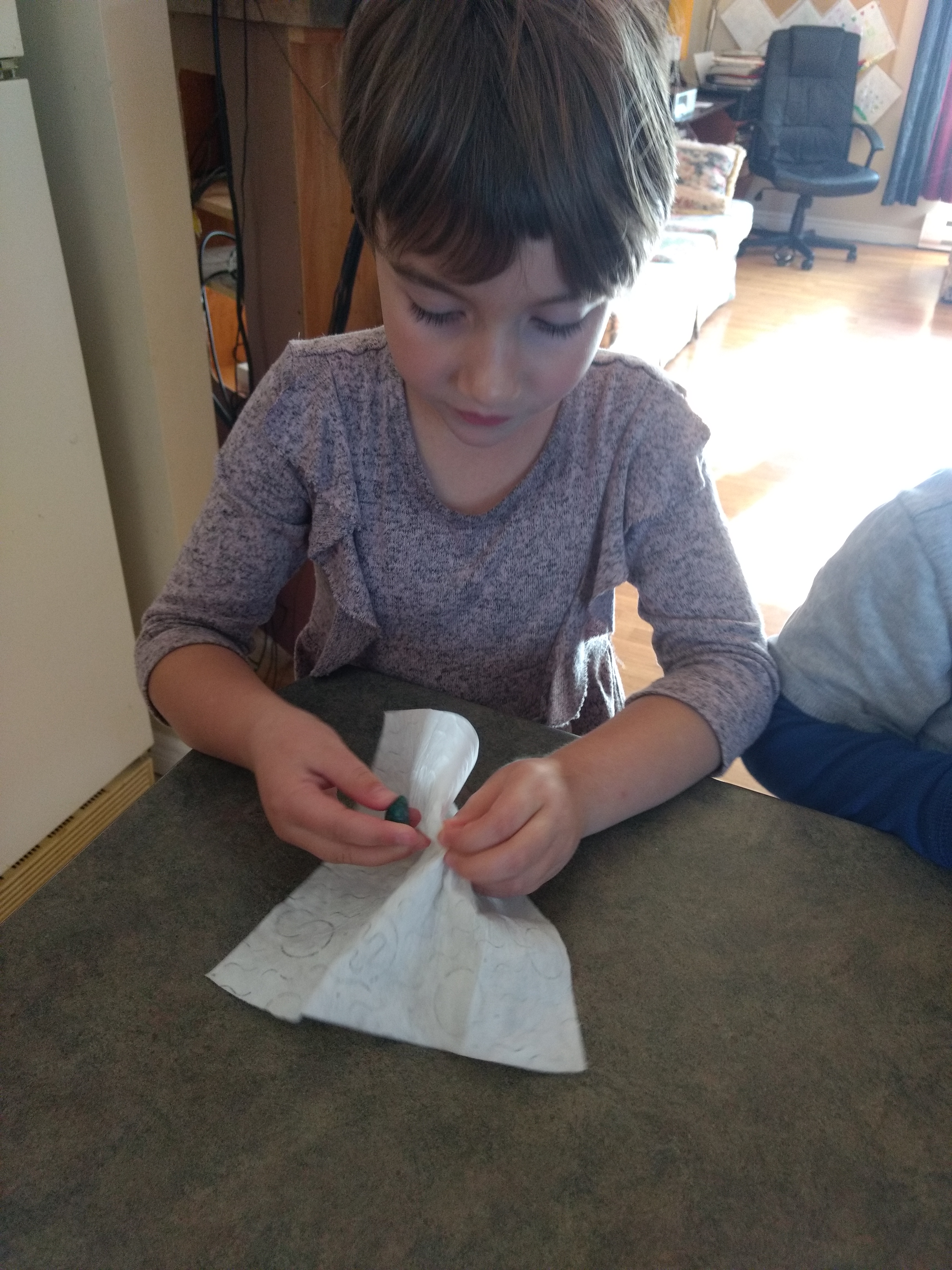 Step 3 we covered our work area with an old cookie sheet and placemats for easier cleanup.