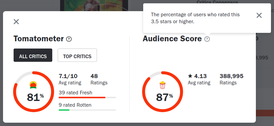 I'm confused by their official explanation, which claims that Audience Scores fall into two categories: A full bucket of popcorn, or a tipped over bucket of popcorn. It is claimed there that a full bucket of popcorn is obtained when at least 60% of users give a rating of 3,5 stars or higher, and a popcorn spill denotes at least 60% of users giving it a lesser rating. However, on the scores on a specific film, the explanation is slightly different.