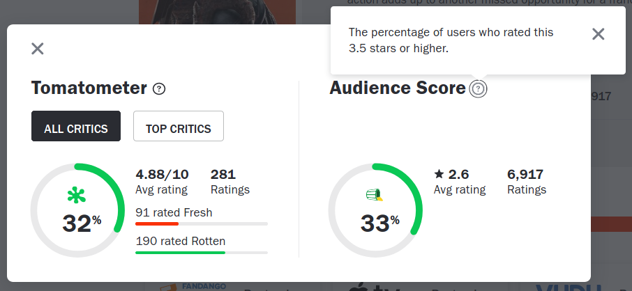 It appears that they changed their system to align the Audience Score with the Tomatometer score, in order to make their film critics appear less out of touch with the dwindling number of people who still bother paying for film tickets. I mean if you really wanted to know whether a film is worth watching, you could just see its download rates on torrent sites over time, but mentioning that kind of objective data is almost as verboten as mentioning the names Harvey Weinstein or Jeffrey Epstein in the same breath as their countless Hollywood beneficiaries.