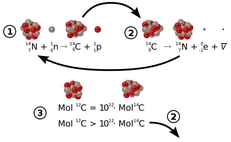 The physics of carbon 14 decay and creation. 1) indicates 14C creation from 14N and cosmic radiation, 2) indicates the radioactive decay of 14C and 3) shows the approximate concentrations of the different isotopes. Illustration by Sgbeer, shared under attribution-share alike 3.0 licence.