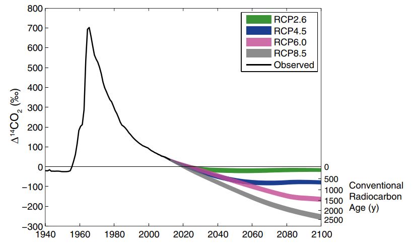 Observed and modeled measured radio carbon ages for atmospheric 14C concentrations. Notice the peak after 1960 because of nuclear testing (more in discussion). Graph from Graven (2015).