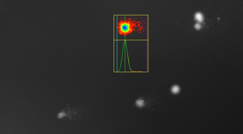 The microscope image is captured by a camera and sent to the PC, where a special software enables us to "score" the cells. The intensity of the entire cell nucleus, the "head" and the "tail" are integrated. The so-called tail intensity, i.e. the ratio of the intensity of the tail to the total intensity of a comet, serves as a measure of DNA damage.