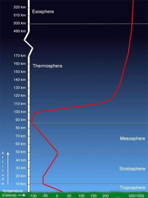 Remember the higher you go the cooler it becomes mantra we were told only applies to the troposphere which is up to 10 km up in the atmosphere.