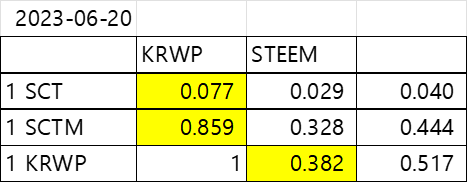 Swap pricesteemCreated with Sketch.abdullar (72)in #sct • 3 years ago 1 SCT = 0.077 KRWP 1 SCTM = 0.859 KRWP 1 KRWP = 0.382 STEEM #swap