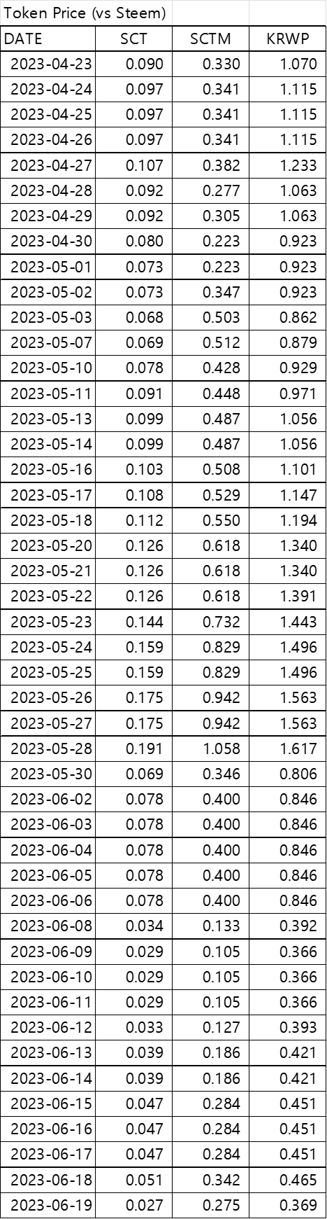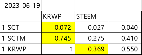 Swap pricesteemCreated with Sketch.abdullar (72)in #sct • 3 years ago 1 SCT = 0.072 KRWP 1 SCTM = 0.745 KRWP 1 KRWP = 0.369 STEEM #swap