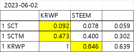 Swap pricesteemCreated with Sketch.abdullar (72)in #sct • 3 years ago 1 SCT = 0.092 KRWP 1 SCTM = 0.473 KRWP 1 KRWP = 0.846 STEEM #swap