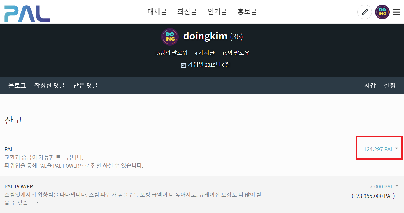 현재까지 누적된 큐레이팅 페이아웃 금액은 124.297 PAL입니다.