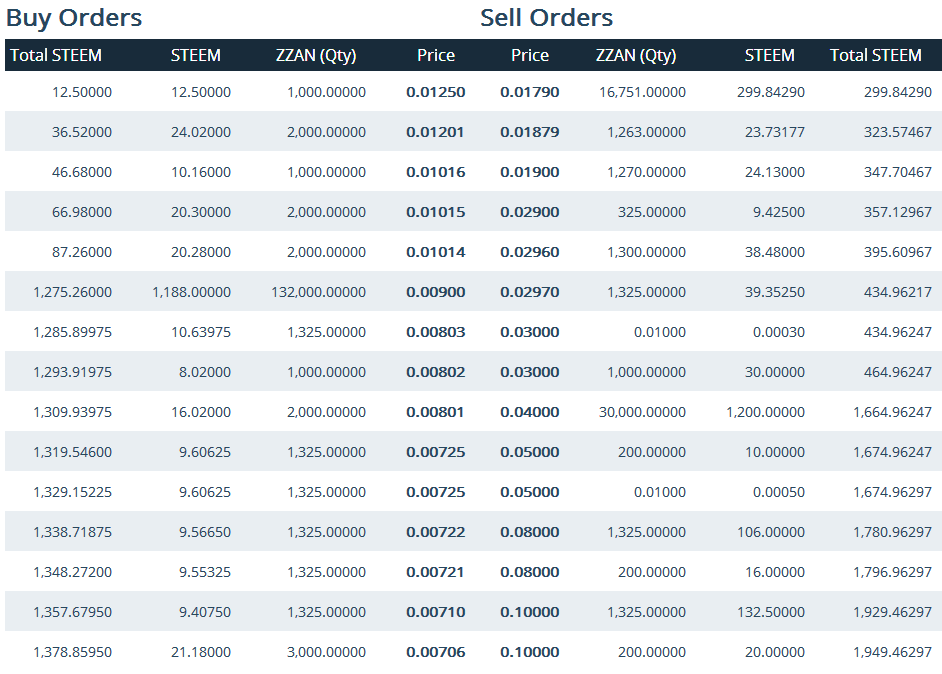 与此同时,steem-engin.com上的挂单绝大多数都是cn区的伙伴,印象比较深刻的是@hertz300,阶梯挂单买入zzan,粗略估计约13000枚左右,很遗憾的是没人愿意卖出。