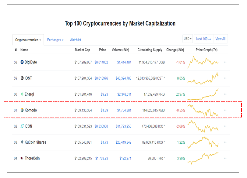 코모도의 시가총액은 61위입니다. 100위권 안에서도 중간에 위치함으로써 든든한 버팀목으로 암호화폐를 지지하고 있다고 볼 수 있습니다. 모네로(13위), 대시(15위), 지캐시(25위)에 비해 다소 낮은 순위지만 그리 큰 격차는 아니라고 보여집니다. 충분히 코모도 또한 경쟁력 있는 프라이버시 암호화폐임이 분명하므로 기대해도 좋을 듯 싶습니다.