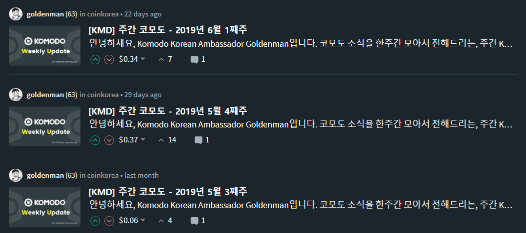 '코모도'라는 이름은 도마뱀이라는 강한 이미지와 프라이버시 코인 계열이라는 어두운 이미지가 공존하고 있지만 스티미언들에게는 왠지 부드러운 이미지로 다가옵니다. 그 이유는 아마 부드러운 이미지를 가지고 계신 고수님(@goldenman)님이 Komodo Korean Ambassador로서, 스팀잇에 코모도를 많이 알렸기 때문일 텐데요^^