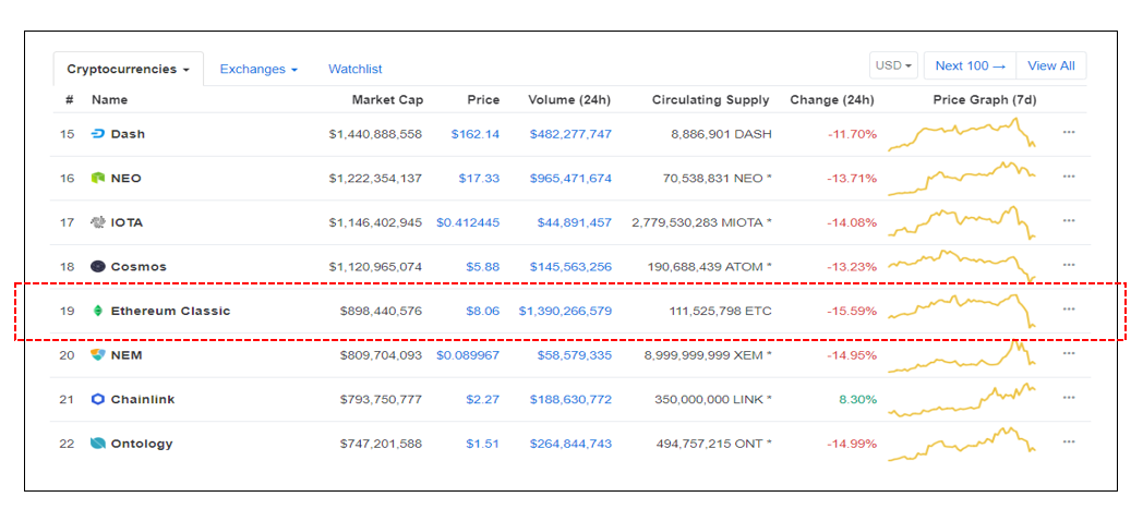 그동안 암호화폐가 많이 탄생하긴 했나 봅니다. 이더리움 클래식이 고작 시가총액 19위라는 사실이 믿겨지지 않습니다. 이더리움이 시가총액 2위인 것에 비하면, 조금 초라한 성적표이긴 합니다. 하지만 진정한 승부는 모두가 기다리는 불(Bull)장에서 판가름 나기에 아직 모든 걸 판단하기에는 이른 감이 있습니다.