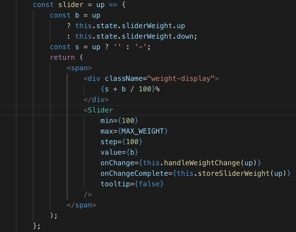 보팅바 부분의 소스에서 보팅바를 변경하면 this.handleWeightChange(up) 이 호출되고 보팅바 변경 후 마우스를 놓으면 this.storeSliderWeight(up) 이 호출됨을 알 수 있습니다.