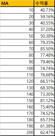 가장 기본적인 이동평균선 전략과 비교해 보았을 때 약간 더 효율이 좋은 정도? 로 표현할 수 있겠습니다. (진입 횟수가 적으니, 수수료 절감 효과...) 훨씬 메커니즘이 복잡한데도 불구하고, 수익이 크게 달라지지 않는 다는 점이 슬슬 나타나기 시작합니다.