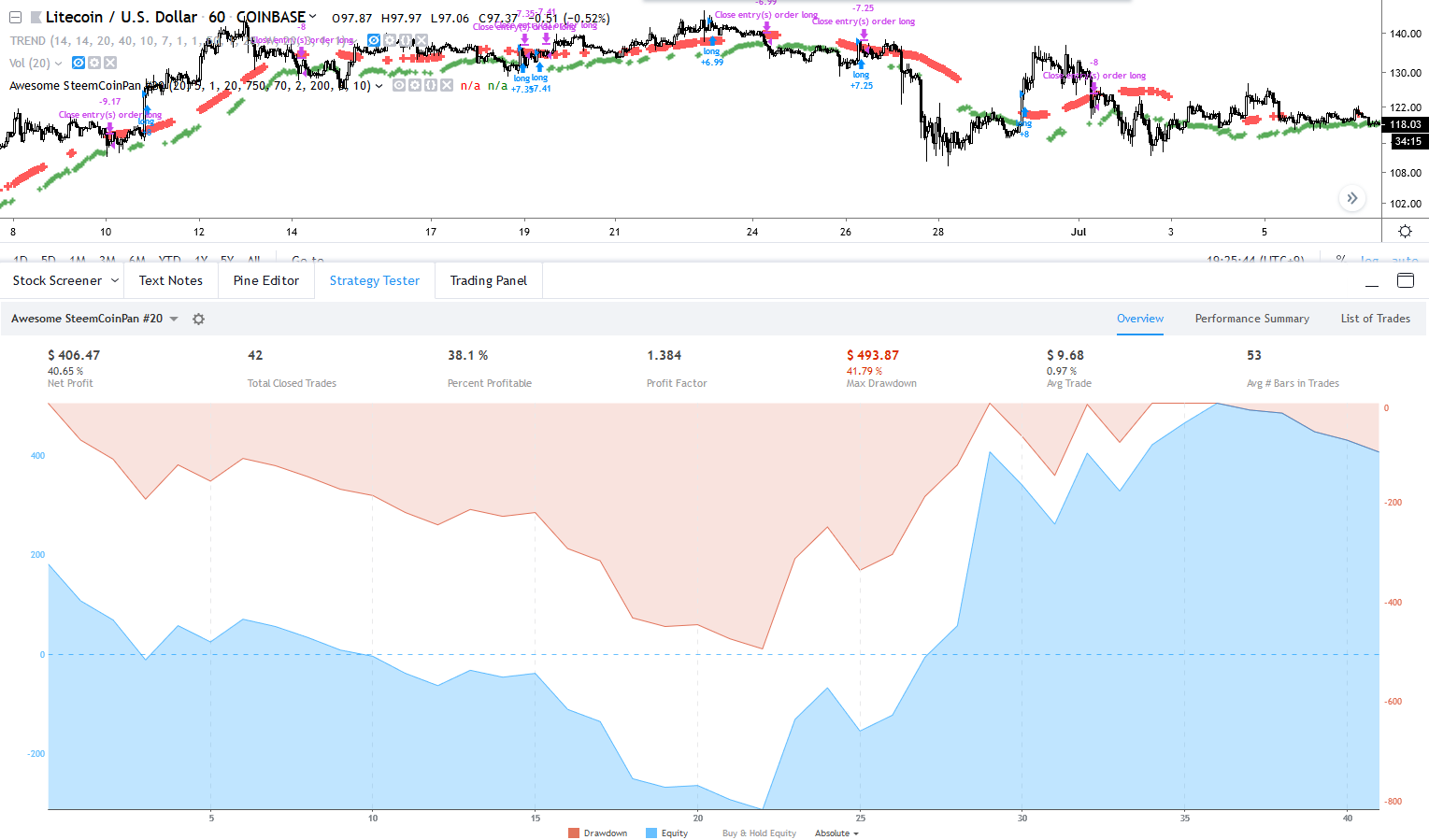 수익률 107%, 손실률 21% 로 아름다운 비율을 가지며, 진입 횟수는 38회로 좀 많이 아쉽습니다.