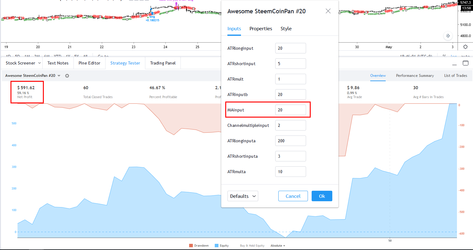 또 하나는 비추세 구간에서 손절선이 벌어질 때, 얼마나 벌어질까 를 관여 하는 Channel multiple 값을 변경하는 방법입니다.