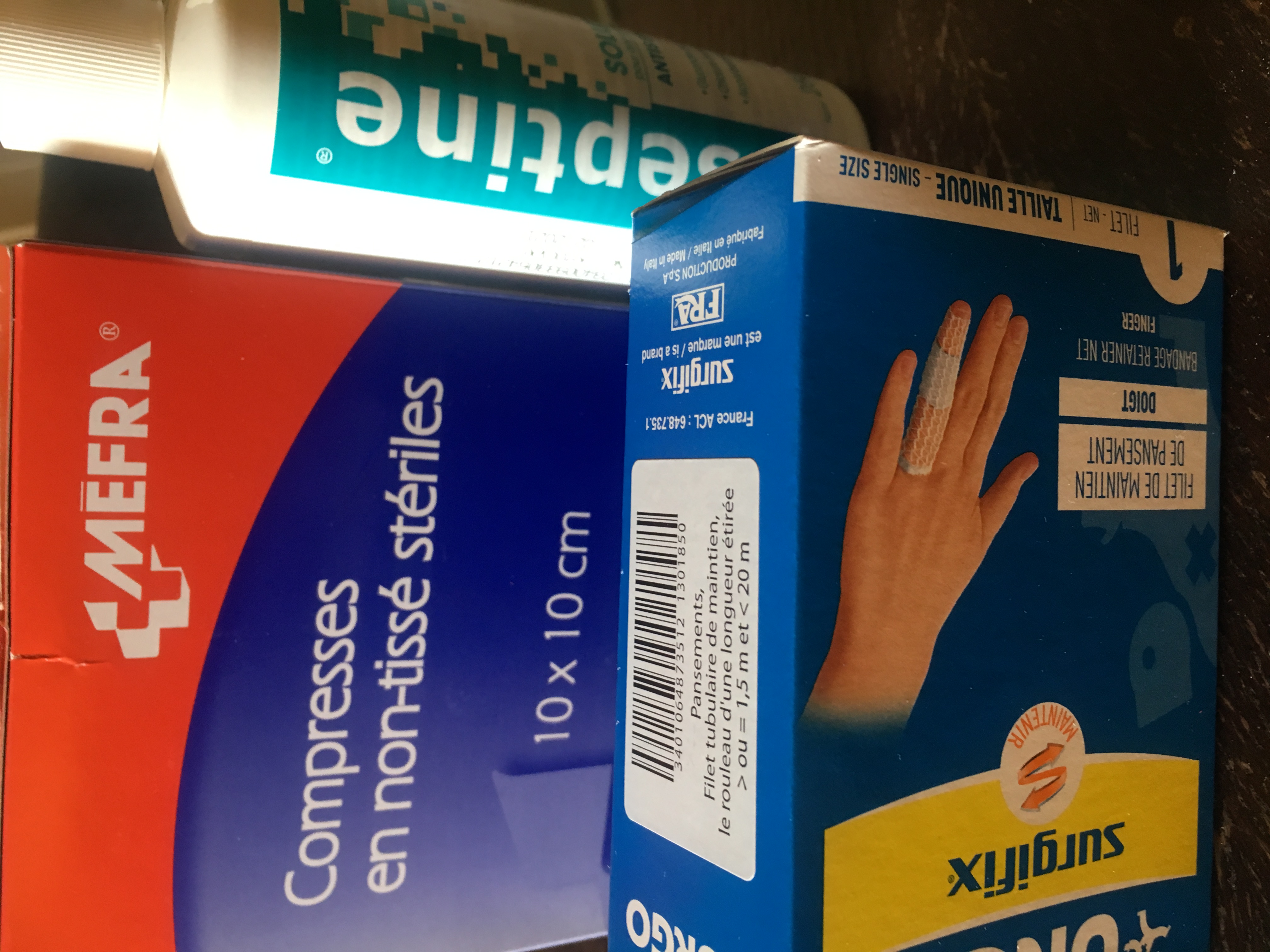 그러면 안되겠지만 혹 프랑스에서 이와 비슷하게 다치면 아래 소독약과 붕대를 참고가 되길.