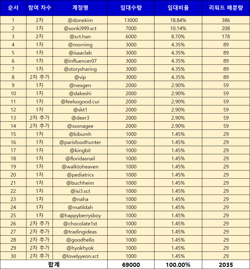 | 순서 | 참여 차수 | 계정명 | 임대수량 | 임대비율 | 리워드 배분량 |
