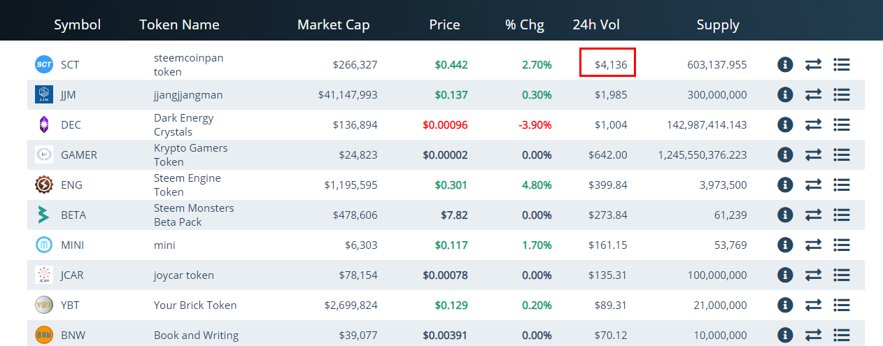 1위인 JJM의 거래량이 9,938달러로 19일대비 15배나 늘었습니다. AAA 토큰의 영향일 것입니다. 주목해서 봐야할 것은 이날 전체적인 거래량입니다. 상위 3개의 토큰이 천단위 달러의 거래를 보이고 있고, 이때 SCT의 거래량이 3위를 차지합니다. 2위인 DEC도 상당한 인기를 안고 상장하게 되었습니다. DEC은 이전 글을 참조하시면 이유를 아실 것 같습니다. (https://www.steemcoinpan.com/sct/@vip/4vmpzk 'DEC 토큰도 반응이 뜨겁네요')