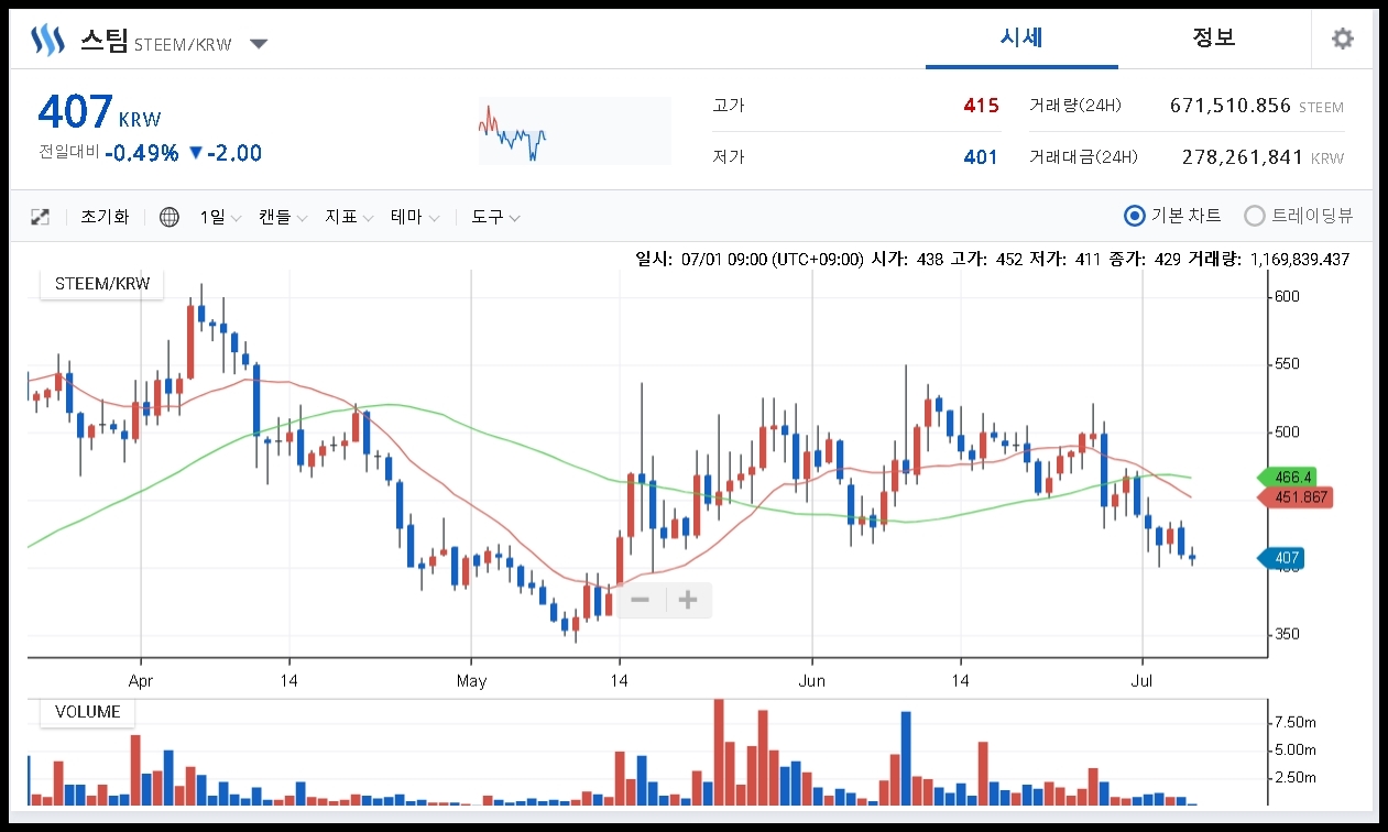 <암호화폐 거래> 스팀 매수 평단가 452원, 현재가 407원... 그래도 난 36,000 원 이익을 보고 있다(?!)