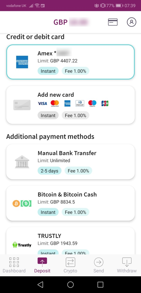 同时还可以申请一张虚拟信用卡,其实是事先充值的借记卡,可以选择美元,英镑,或者欧元。如果需要的话,还可以申请一张实体卡,但需要缴纳邮寄费。有了信用卡后,就可以方便进行加密货币->法币->消费了。