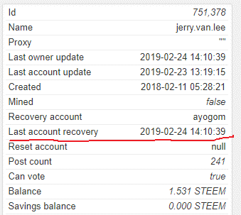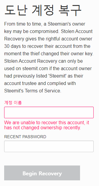 이건 이제 Recovery account을 변경한 경우 입니다. 변경을 했다는 것은 아마도 신뢰할 수 있는 누군가 이거나 혹은 본인의 보조 계정으로 변경되어 있는 상황일테고요, 신뢰할 수 있는 누군가라면 위에 2번과 같은 형태로 진행하시면 됩니다. 다만 보조 계정인 경우에는 직접 진행 하셔 야 하는데요