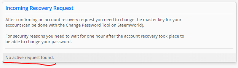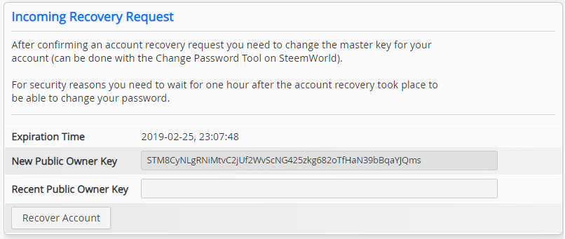 계정명과 해킹 당했던 마스터 패스워드 혹은 오너 키, 즉 기존 해킹당해서 변경전인 값을 입력해야 합니다. 하지만 조건이 붙습니다. 스팀 체인에서는 30일동안 과거 암호값을 보관하기 때문이 그 이상 지나버리면 복구가 불 가능 합니다. 이렇게 정상적으로 접수를 하면 비지니스로 5일을 예상해야 합니다. 하지만 실제는 그보다 일찍 끝나지만 최대 비지니스 5일이라는 점을 명심해야 합니다. 어쩌면 그 사이에 파워다운을 할 수 있기 때문에 마음이 타 들어 갈 수 있음을 명심해야 합니다.