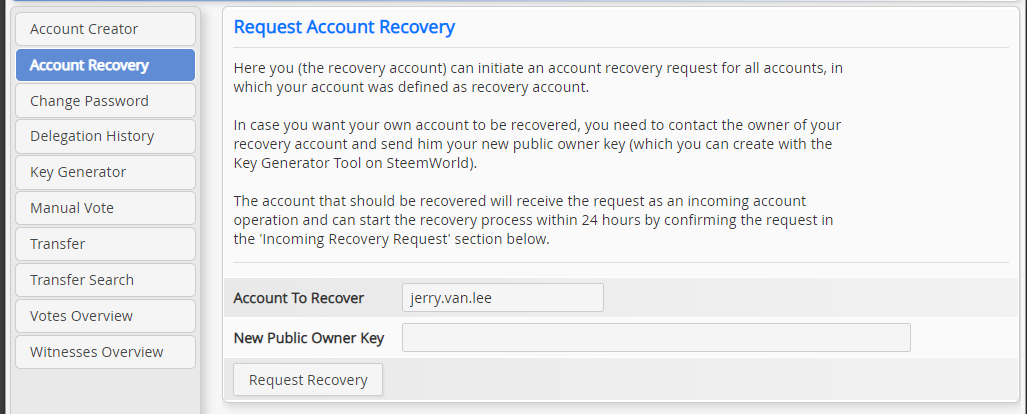 '3. 만약 해킹된 계정(@jerry.van.lee) 의 Tools-Account Recovery-Incoming Recovery Request 신청이 되어있지 않으면 복구 항목이 뜨지 않습니다. 즉 위의 Recovery account(@ayogom)의 역활은 Incoming Recovery Request 의 메뉴를 활성화 하는 데 있습니다.
