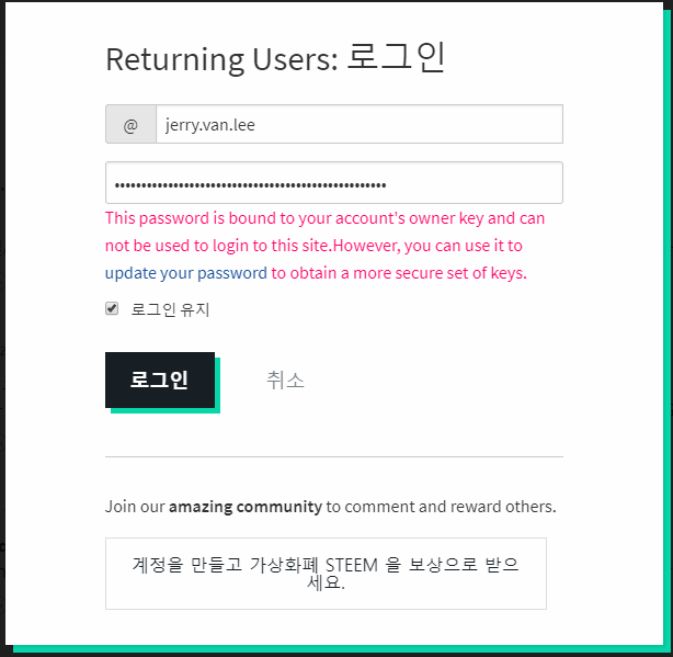 이 경우는 스팀잇 가입을 재단을 통해 진행한 경우 입니다. 이때 중요한 포인트는 가입시 어떠한 이메일로 가입을 했었는지 명확하게 알고 있어야 한다는 점입니다. 만약 이메일을 모르신다면, Recovery account 를 바꾸실 것을 제안드립니다.