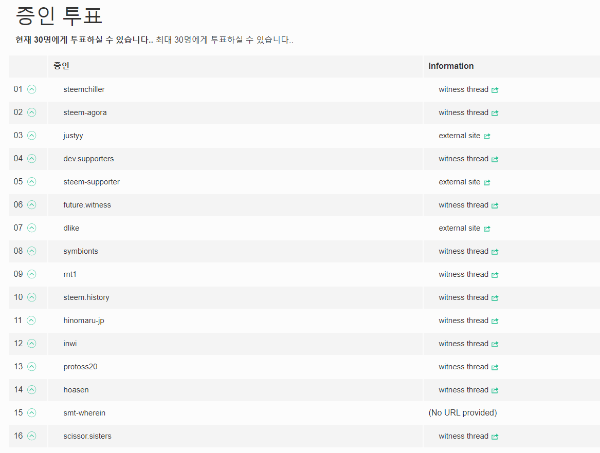바로 500SP 업 이벤트로 유명하신 @steem-agora 님도 이들중 한분이시죠. 이 증인 명단을 보기 위해서는 아래의 링크를 접속하시면 됩니다.
