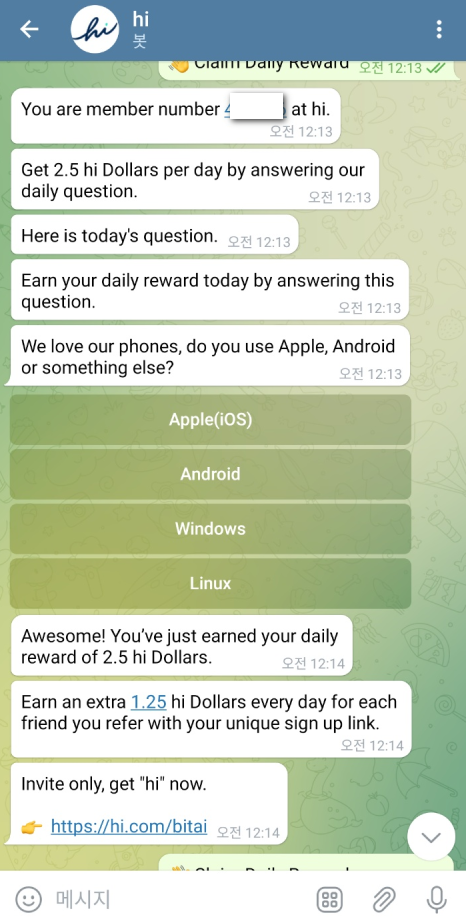 오늘의 채굴을 위해 "Claim Daily Reward"를 클릭합니다. 메일 퀴즈가 나오는데, 퀴즈 내용은 뭐 어떤 폰을 사용하냐 이런 겁니다. 적당한 답을 클릭하면 매일 2.5 hi Dollar 를 채굴합니다.