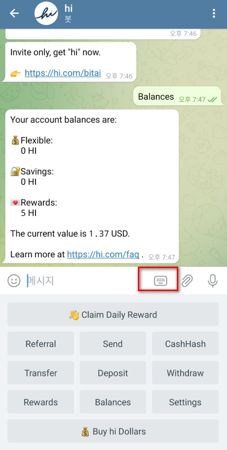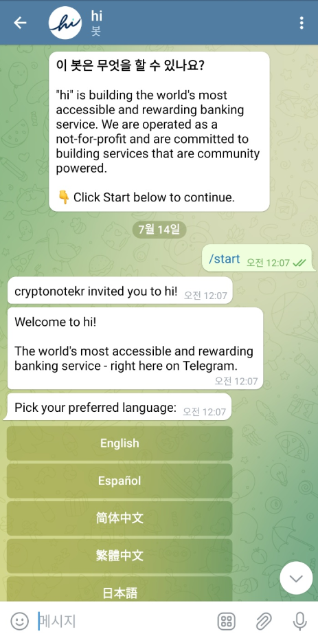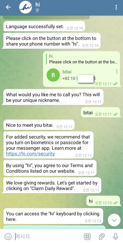 언어 설정이 끝나면, "hi" 버튼을 클릭 후 자신의 휴대폰 번호를 메신저로 보냅니다. 휴대폰 번호는 +82 10-xxxx-xxxx 형식으로 보내시면 됩니다.
