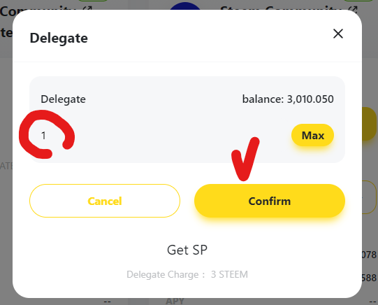 1을 입력하고 confirm을 누르면 된다. 그러면 수수료인 3 steem이 지갑에서 빠져나간다.
