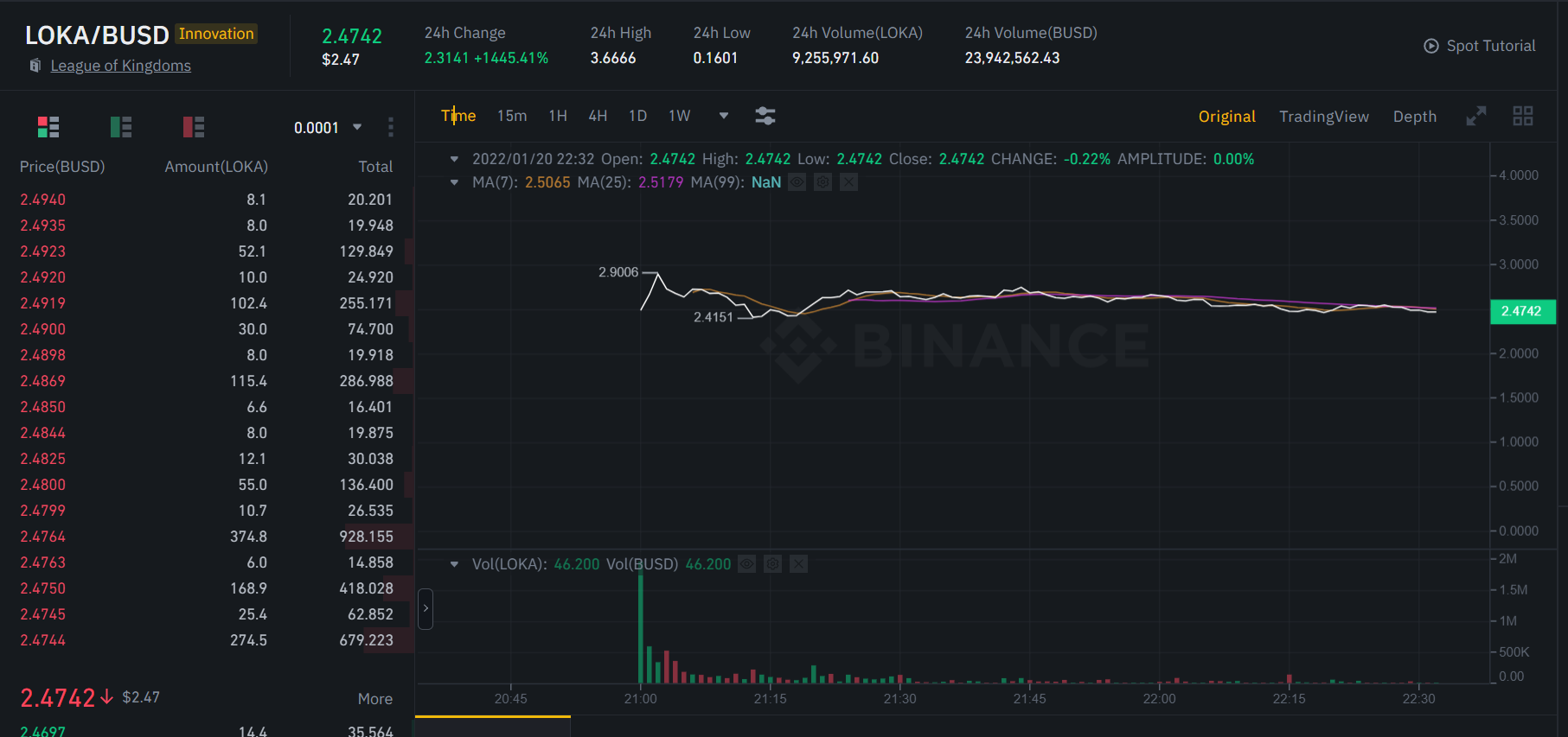 [LOKA] 바이낸스 런치패드 완료deer3 (78)in SCT.암호화폐.Crypto • 4 years ago 런치패드가 끝나고 리그 오브 킹덤즈의 토큰 LOKA가 상장했습니다. 약 14~15배 정도 오른 가격에서 거래 중. 뭐 나쁘지 않네요. BNB를 런치풀에서 다른 토큰 채굴하면서 둔 것이라 그냥 놀리고 있었던 것도 아니라 더 좋군요. 반 정도는 지금 가격인 2.5달러 근처에서 팔고, 반 정도는 좀더 가져가 볼 생각입니다. #bnb #loka #sct-kr #sct-defi #bs #union #zzan #krsuccess #sct