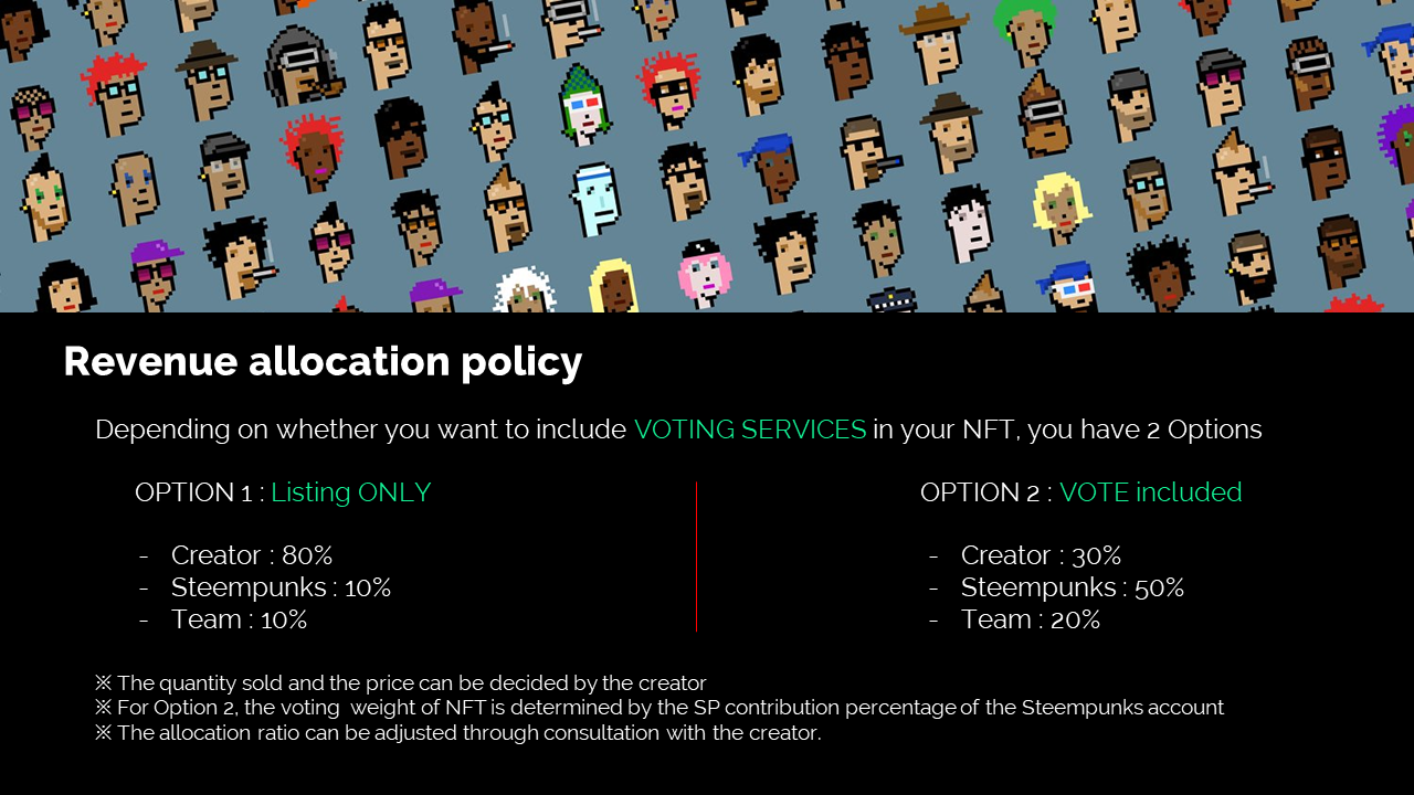 - 다만 NFT의 판매 수익의 배분은 다음의 옵션 중에 하나를 선택해야 하며, 기본적인 배분 비율은 다음과 같습니다