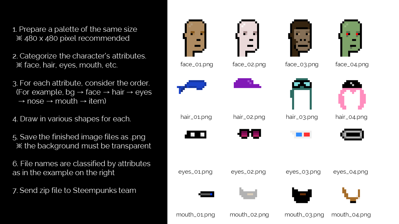 그러나 크립토펑크 및 스팀펑크가 사용한 랜덤 조합 알고리즘은 오리지널 크리에이터도 예상하지 못했던 정말 특이한 캐릭터가 만들어진다는 점에서 가급적 랜덤 조합 방식을 추천합니다