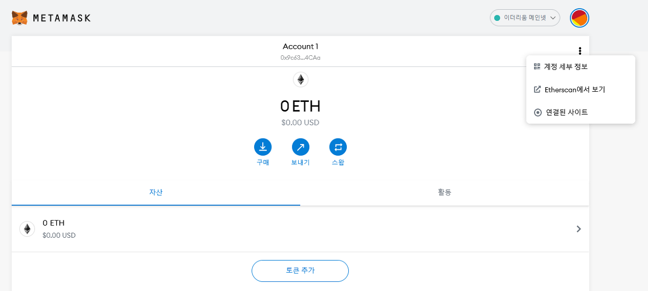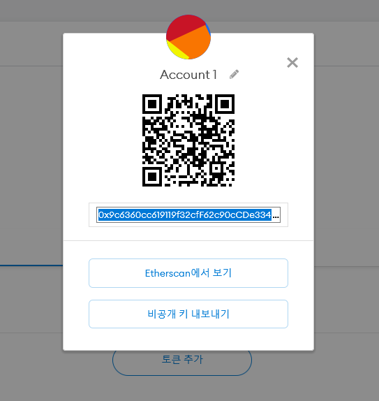 Account1 이라는 문구 밑에 회색으로 된 0x로 시작하는 문구가 보이시나요? 너무 복잡해서 일반적으로 외우기는 힘들지만, 이 회색으로 된 문구가 내 메타마스크 지갑 주소입니다. 지갑 주소는 계좌번호와 같아서 휴대폰 메모장이나 이메일, 카카오톡 등에 저장해놓고 사용하셔도 됩니다.