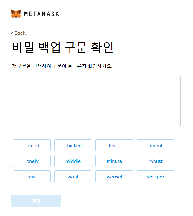 ⑤ 12개의 비밀 백업 구문을 잘 저장했는지 확인하는 절차입니다. 순서대로 단어를 클릭하여 선택한 뒤에 [확인] 버튼을 클릭합니다.