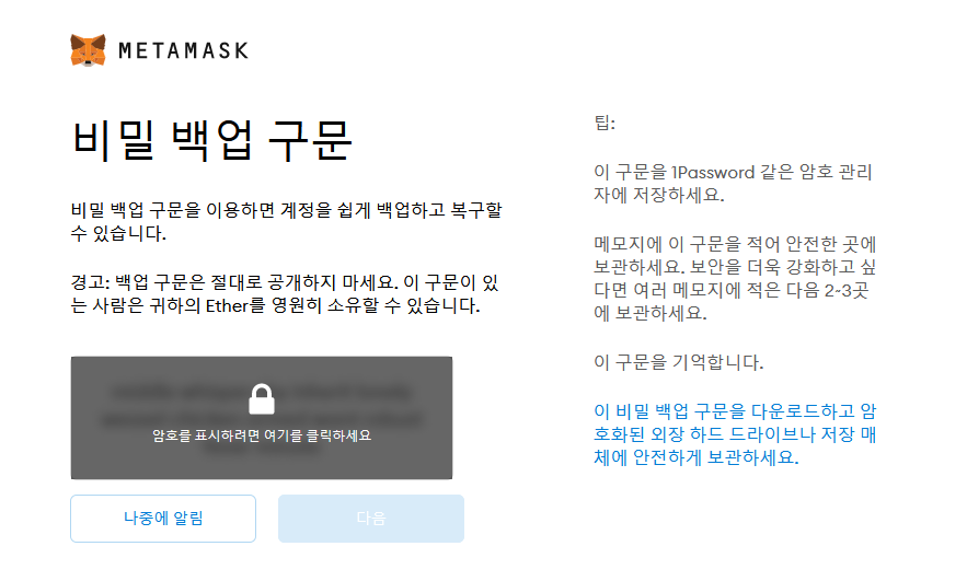 (2) 시드 구문(=비밀 백업 구문, seed phrase) : 메타마스크가 지워졌거나 컴퓨터를 포맷한 경우에도 다른 PC나 휴대폰에서 내 이더리움 지갑에 다시 로그인할 수 있는 복구용 비밀번호입니다. 절대 타인에게 알려주어서는 안되고, 분실해서도 안되기 때문에 안전하게 잘 보관하셔야 합니다.