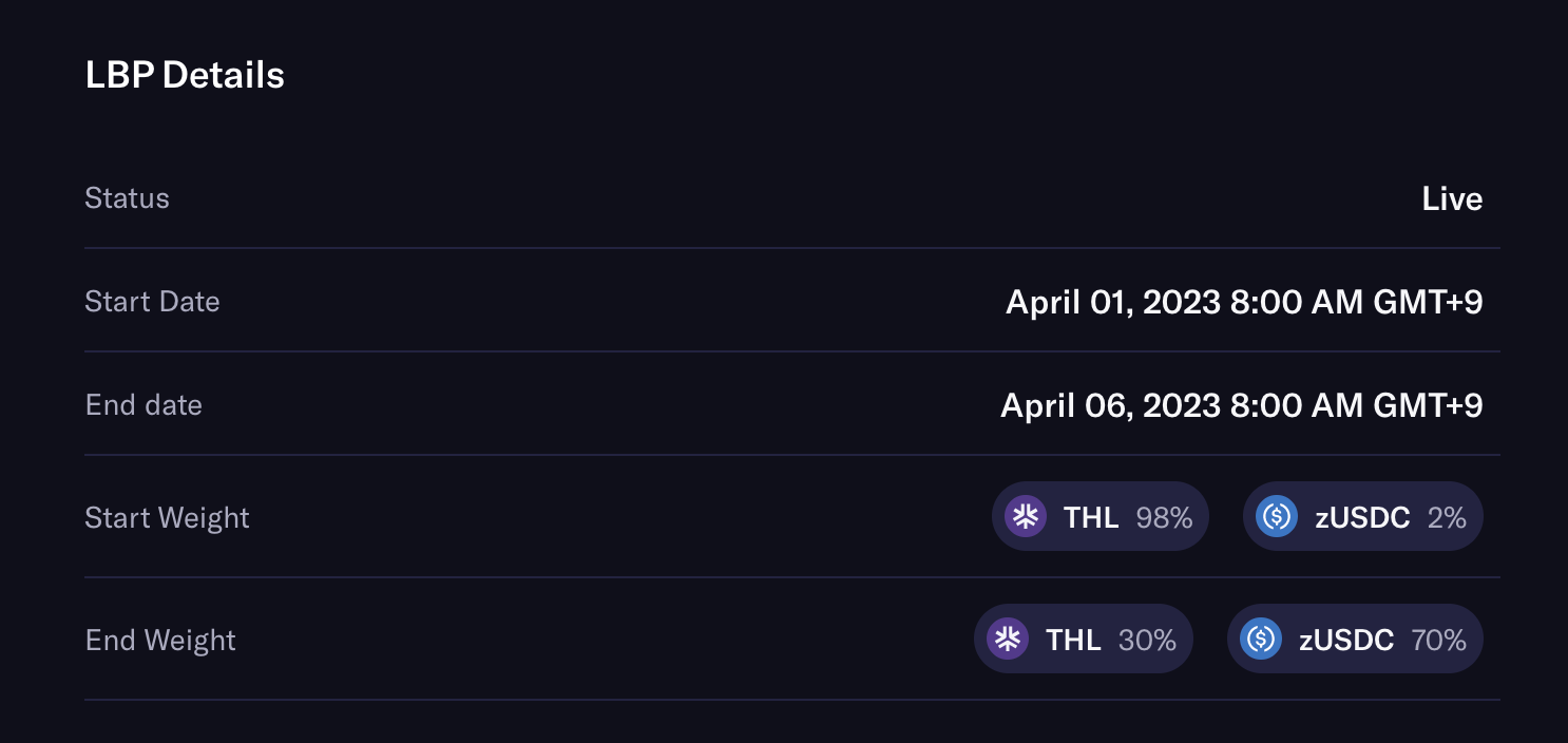 개인적으로 THL의 토큰 세일 방식인 유동성 부트스트랩핑 풀(LBP) 방식은 참여자들의 토큰 구매 가격이 제각기 다르고, 토큰 세일 이후에 거래소 상장 보다는 DEX 거래에 집중된다는 점에서 선호하는 방식의 토큰 세일은 아닙니다.