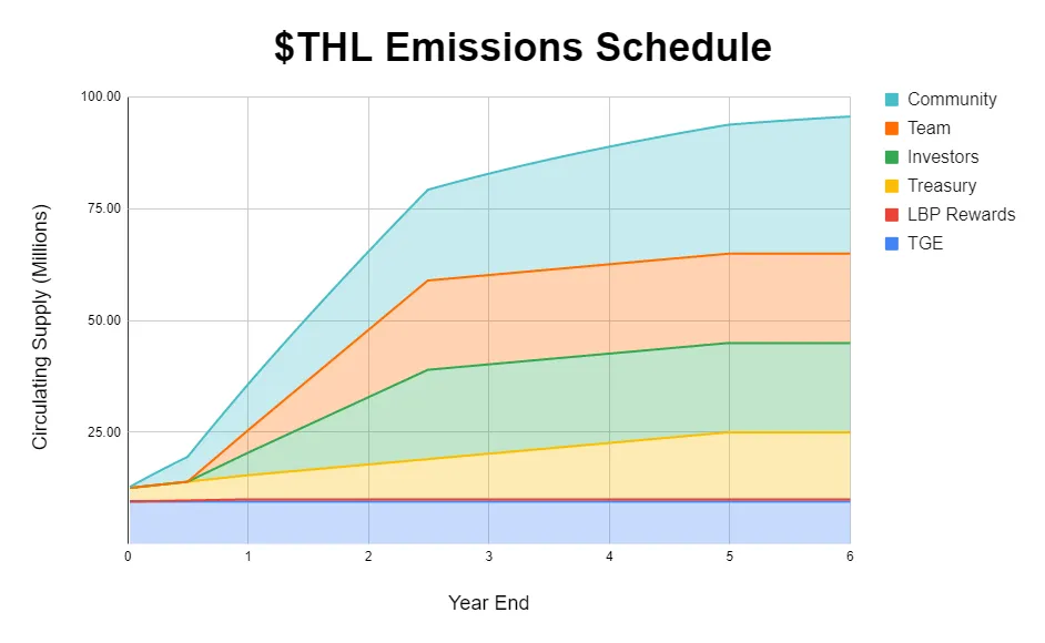 토큰 판매 후 초기 유통량은 전체 공급량의 13%에 해당하는 13,000,000 THL이며 팀, 어드바이저 투자자 배분 물량은 TGE시점부터 기산하여 6개월 클리프에 2년 락업 해제 조건인 것이 베스팅 조건의 핵심인 것으로 보입니다.
