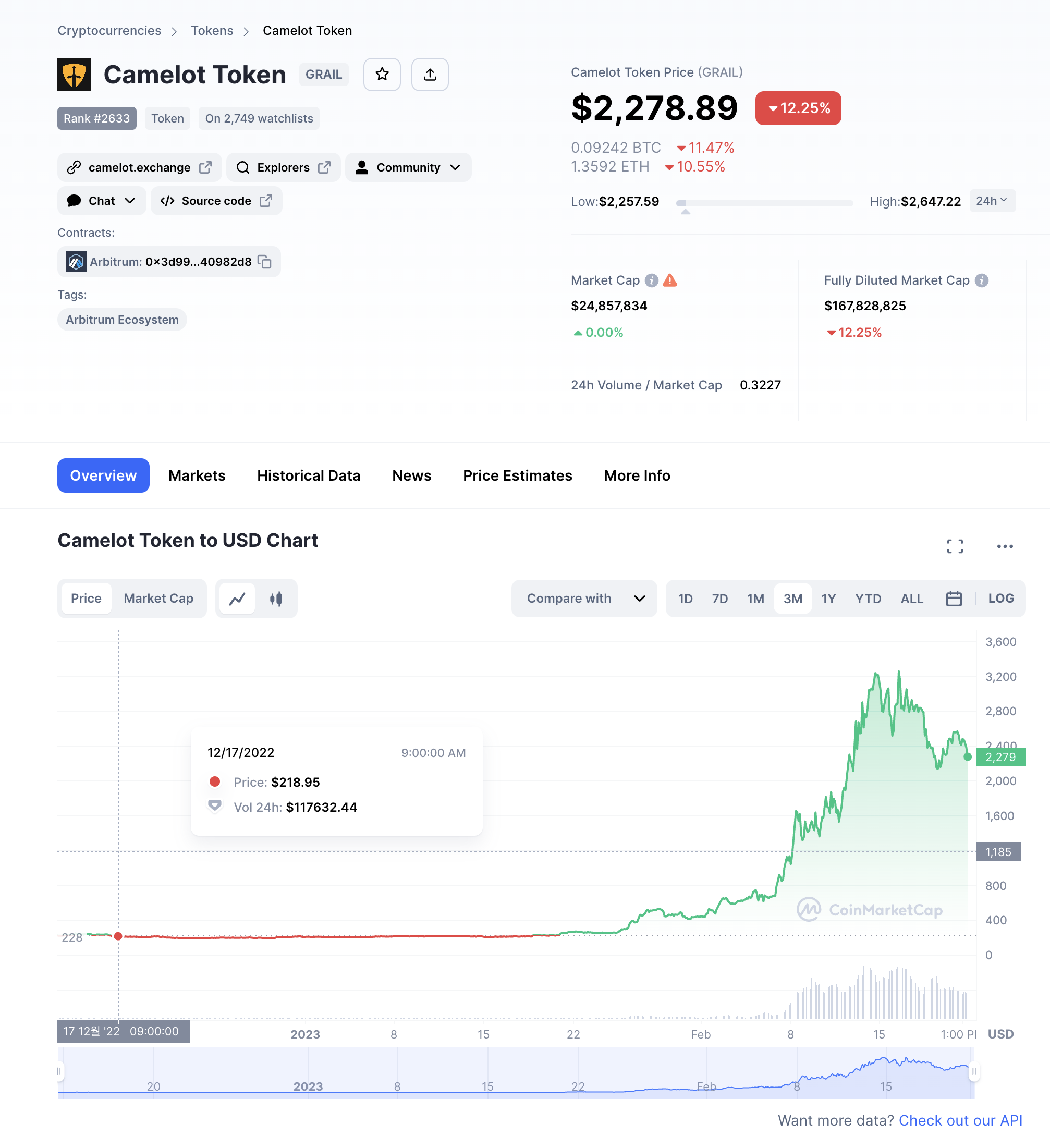 그 중에서도 아비트럼 네이티브 DEX로 가장 높은 지배력을 보여주며 많은 투자자들과 프로젝트들로부터 가장 큰 관심을 받고 있는 것이 바로 카멜롯(Camelot)인데, 2022년 12월초에 출시된 카멜롯의 GRAIL 토큰은 2달 반만에 10배를 넘어가는 폭발적인 성장을 보여주었습니다.