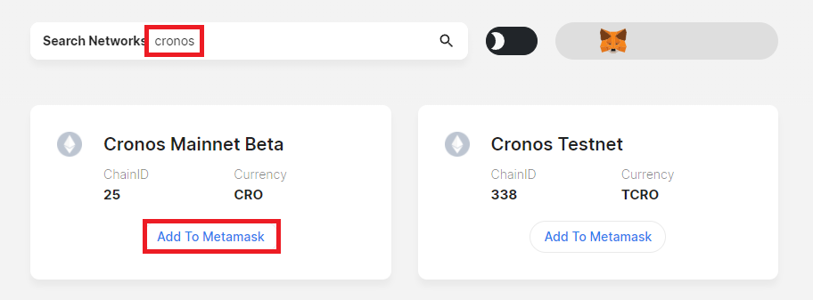 - https://chainlist.org/ 접속 → 메타마스크 연결 → 검색어에 cronos 입력 → 메인넷 베타 하단의 Add To Metamask 클릭