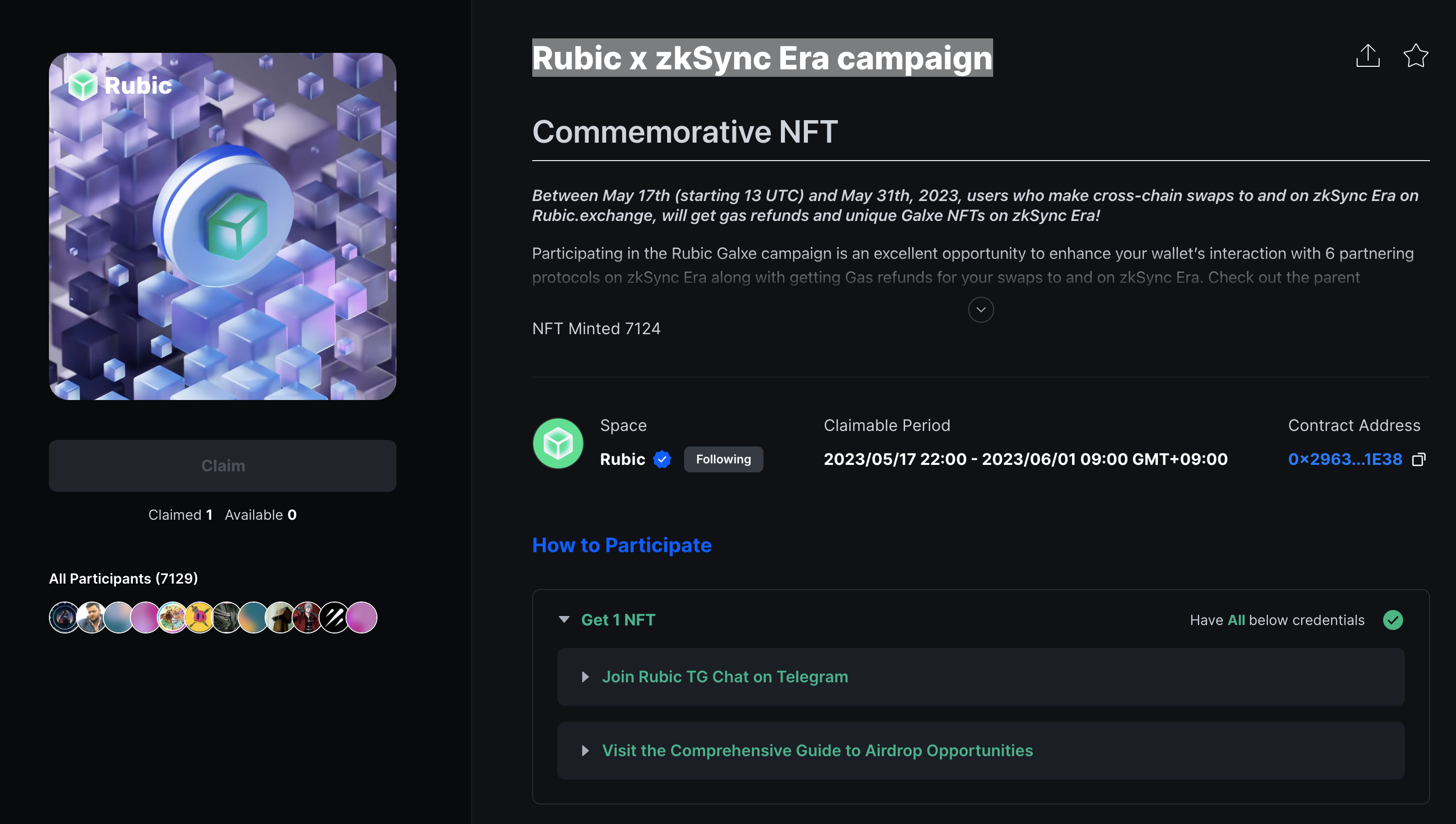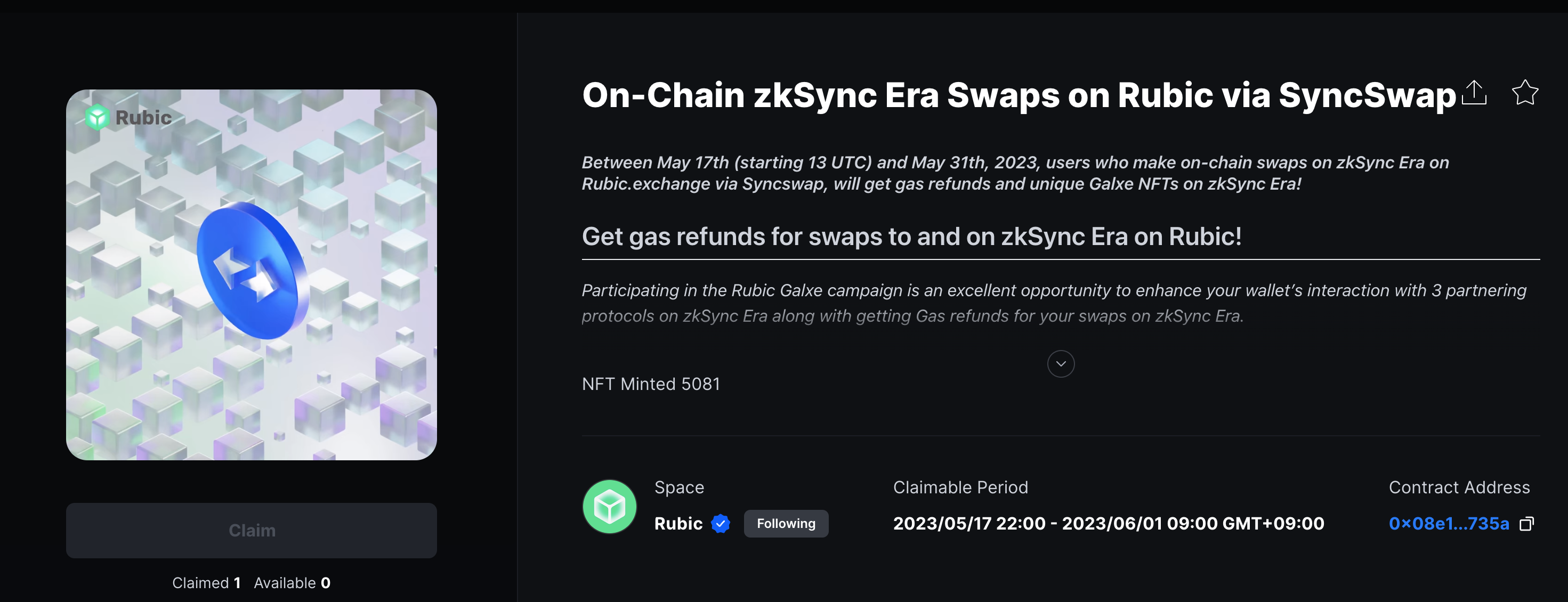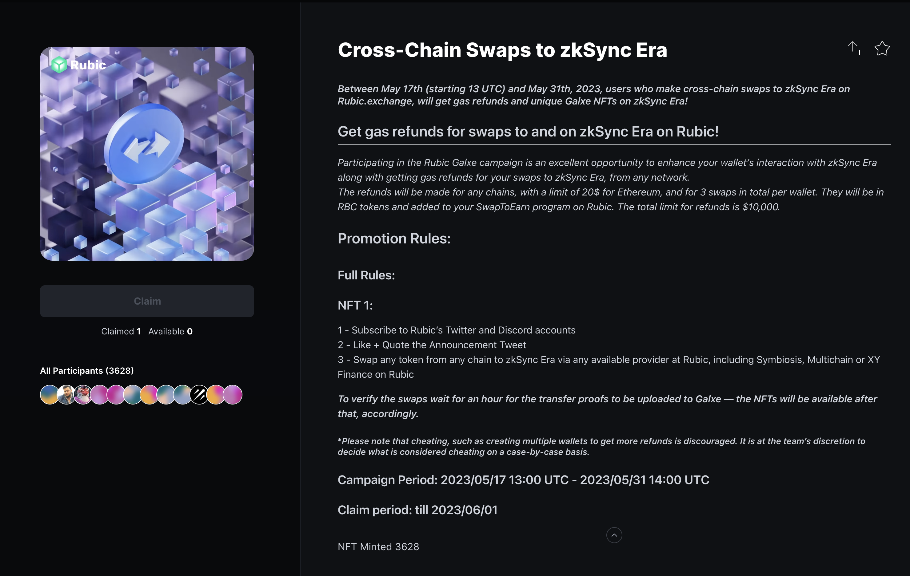 아래의 Galxe 태스크들을 수행하고 해당 NFT들을 클레임하면 되는데, 태스크들은 Rubic 소셜 미디어 채널 팔로우 및 리트윗, Rubic Exchange를 이용하여 크로스체인 스왑 및 zkSync Era 상에서의 토큰 스왑 정도로 요약할 수 있습니다.